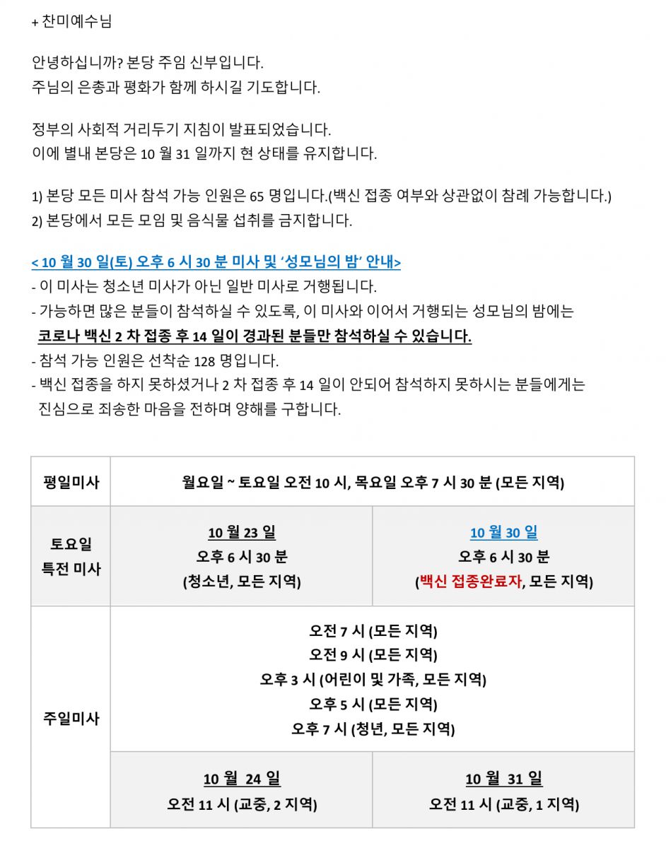 대면 미사 안내(10월18일~31일)