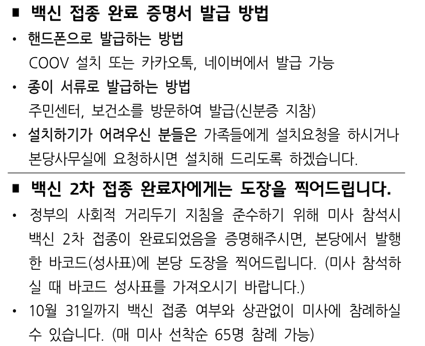 코로나19 백신 접종완료자, 본당 확인 도장 안내