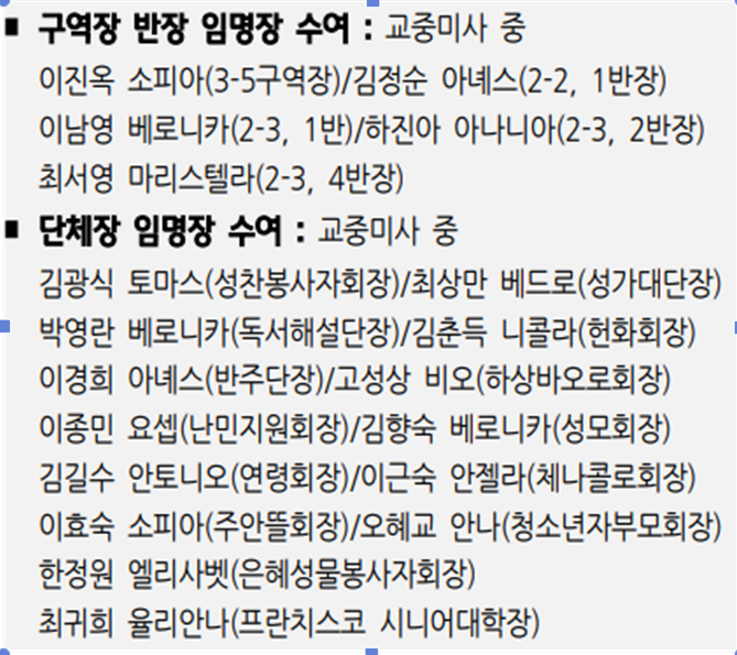 2024 12.8 교중미사시  주임신부님에 의해 아래와 같이 임명장 수여가 있었습니다.