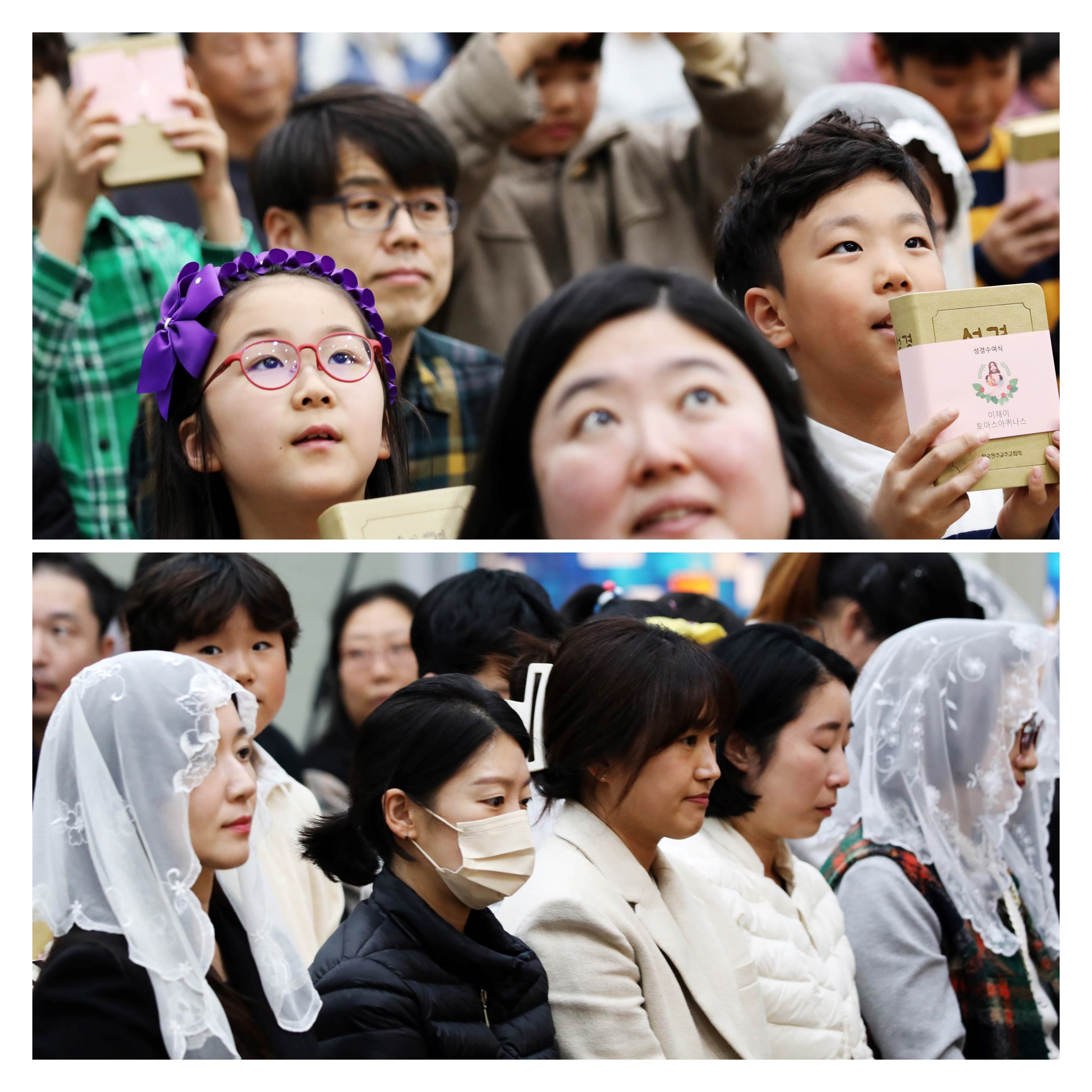 부모들은 경건한 마음으로 신부님께 받은 성경을 자녀에게 전해주며 생명의말씀으로