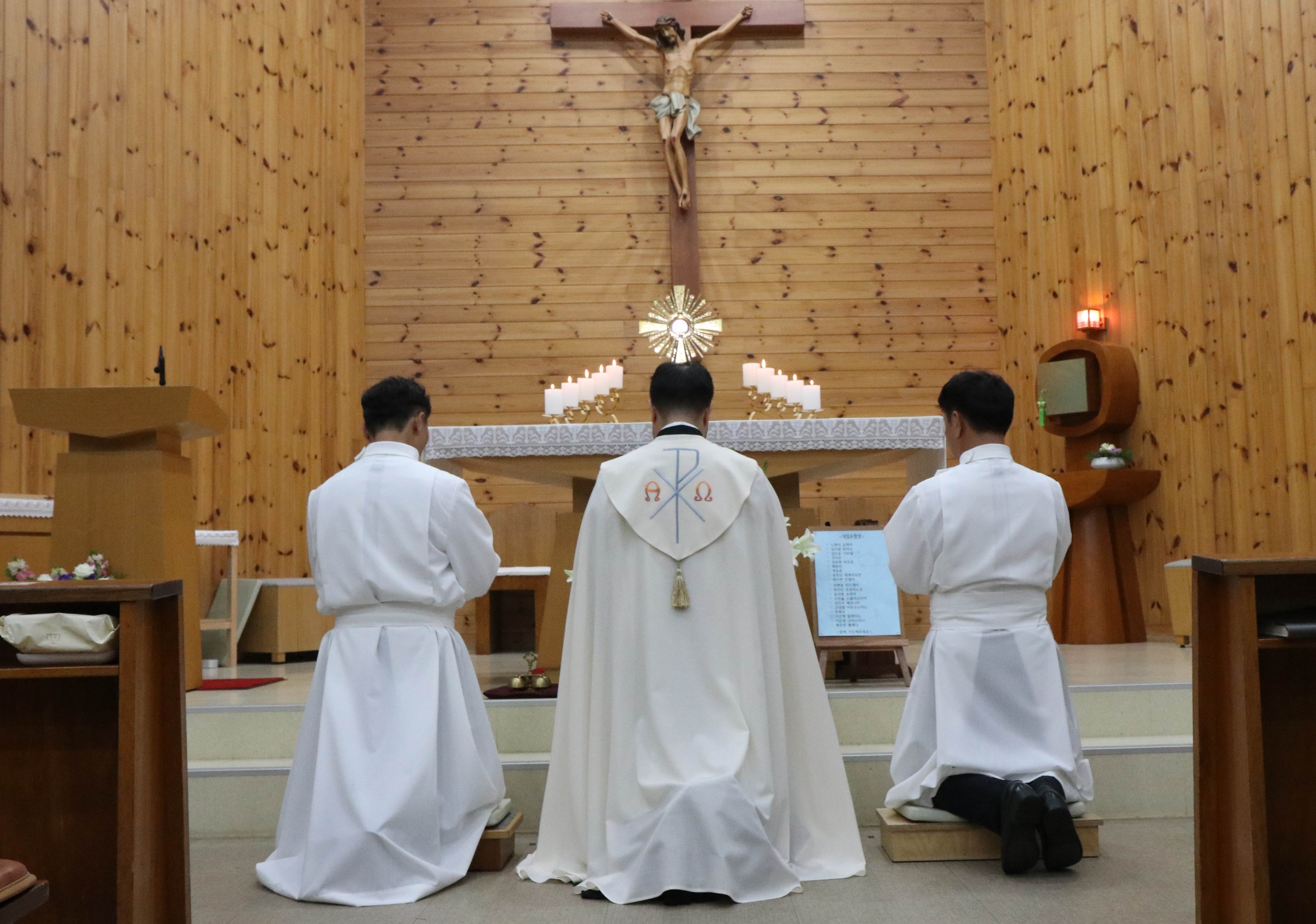 * 사제는 성체를 현시하고 제대 앞으로 내려와 무릎을 꿇고 분향을 한다.