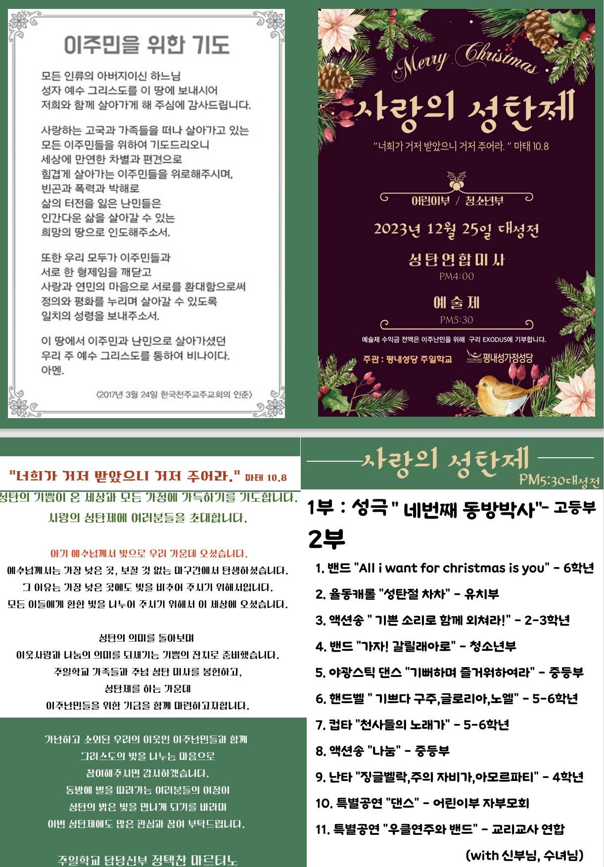 주님성탄대축일, 어린이 청소년이 함께 모여 연합미사를 드리고 공연도 있었네요. 이번 공연은 어린이 청소년 함께 하는 데에도 의미가 있었지만, 이번 공연 수익금을 전액 구리 엑소더스 이주민들을 위하여 봉헌한 데에 더 큰 의미가 있겠네요. 함께 기뻐하고 함께 나누는 진정한 그리스도인의 모습을 보여준 우리 어린이 청소년들~~ 멋져요!! 그동안 이번 공연을 위해 준비하고 애써주신 모든 분들에게 감사 인사드립니다. 여러분 덕분에 우리 공동체도 즐거웠고 행복했습니다.