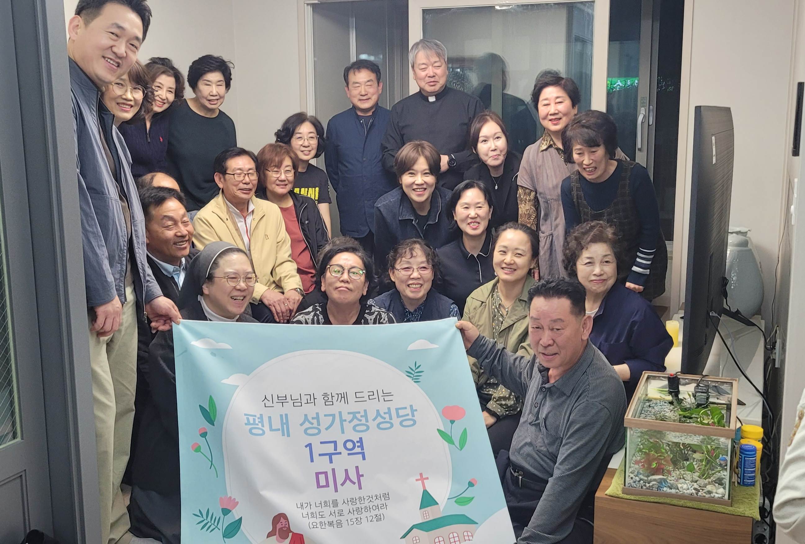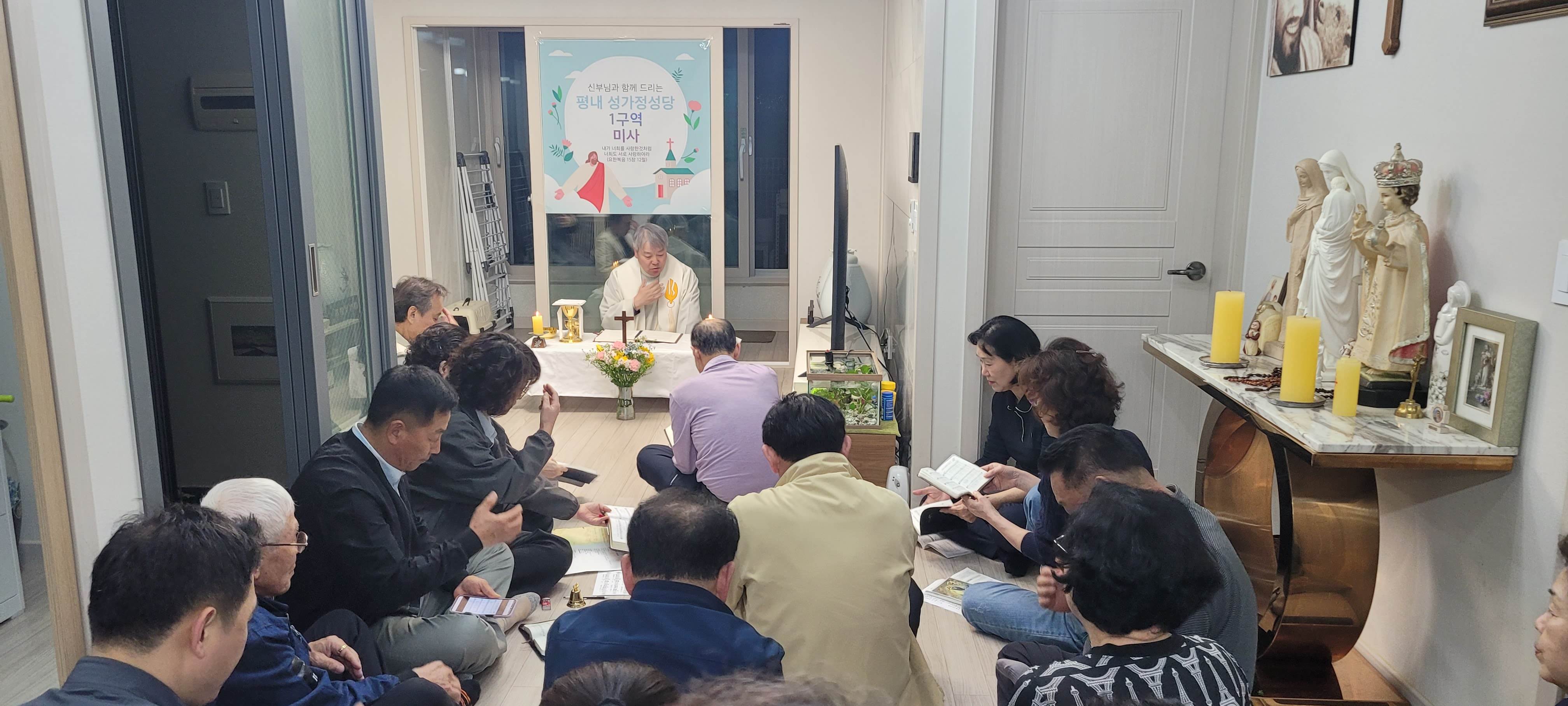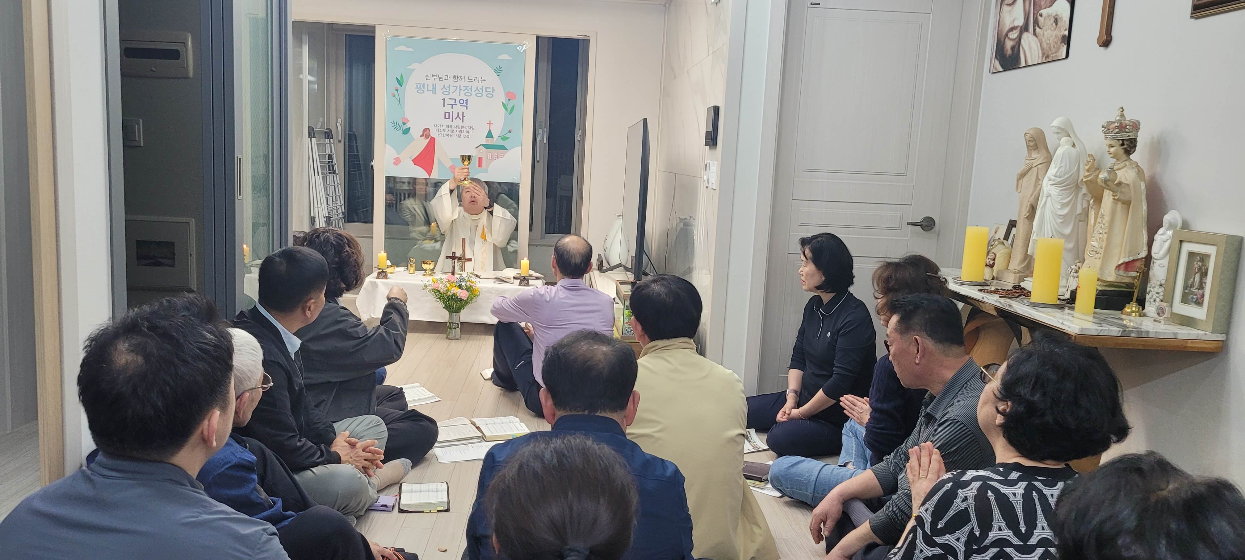 2019년 6구역으로 시작되었던 구역 미사가 코로나로 한 구역만 진행되고 중단되어 너무나도 아쉬웠었는데, 2024년 새로 다시 시작되었습니다. 1구역 레아 구역장님 댁에 다들 모이셨네요. 28분이나 옹기종기(?) 모여서 친밀한 미사와 더불어, 직접 만드신 김밥과 수육, 도토리묵 등 맛있는 음식도 나누셨다고 합니다. 모인 김에 성가대회에서 부를 성가도 연습하셨다고 하네요 ^^. 즐거운 시간 보내셨네요. 다들 우리 구역 미사를 기다리실 법도 합니다. 이번에는 중단없이 잘 진행되기를 바랍니다.