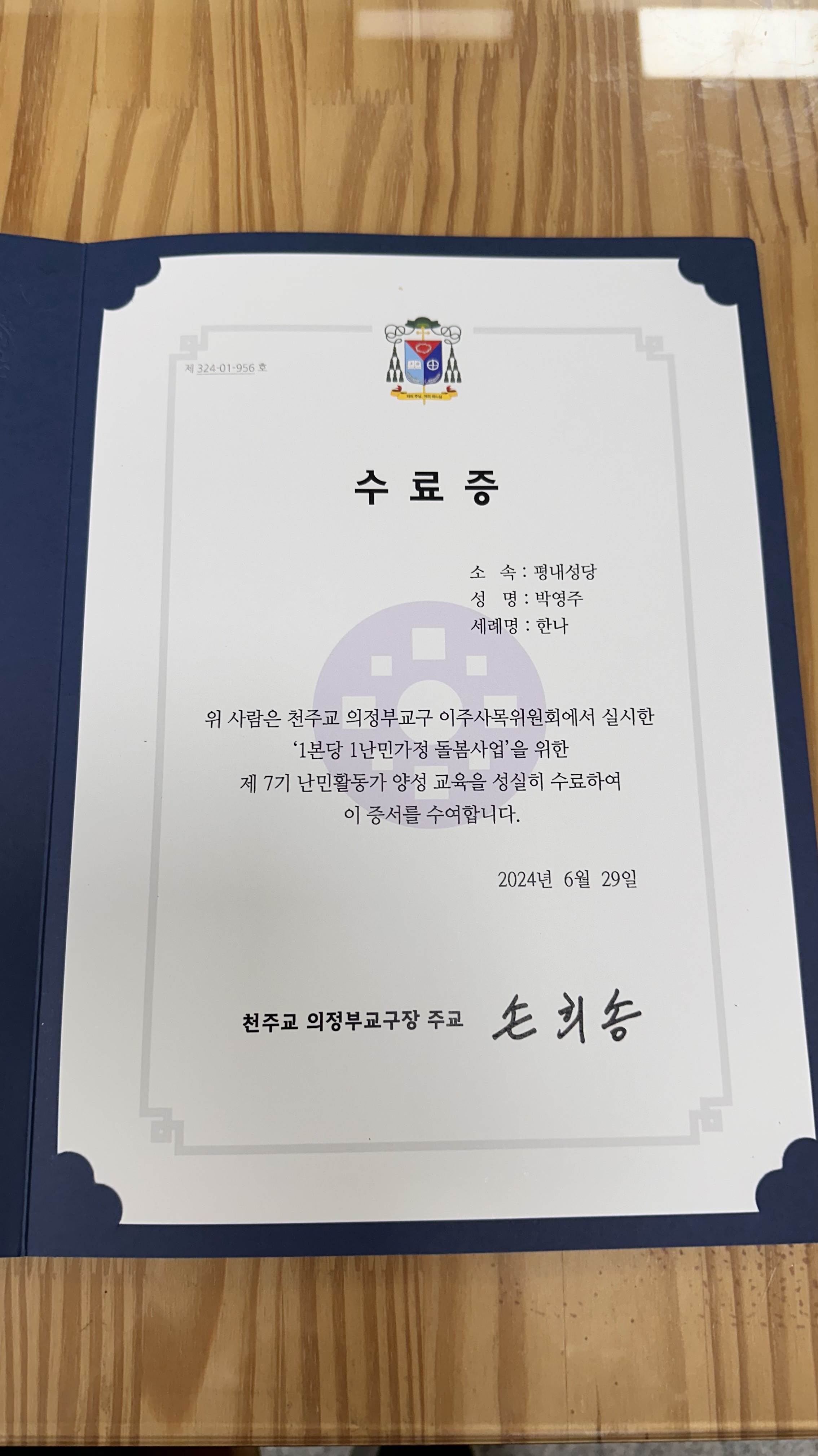 또한, 난민활동가 양성 교육을 부부가 함께 다녀오셔서, 수료증까지 받으신 요한과 한나 부부께도 깊은 축하와 감사의 인사 드립니다. 모쪼록 지극히 거룩하신 예수성심의 마음으로 난민들을 위하여 봉사하여주시기를 바라며 주님의 빛이 이 가정에 항상 함께 하시기를 빕니다.