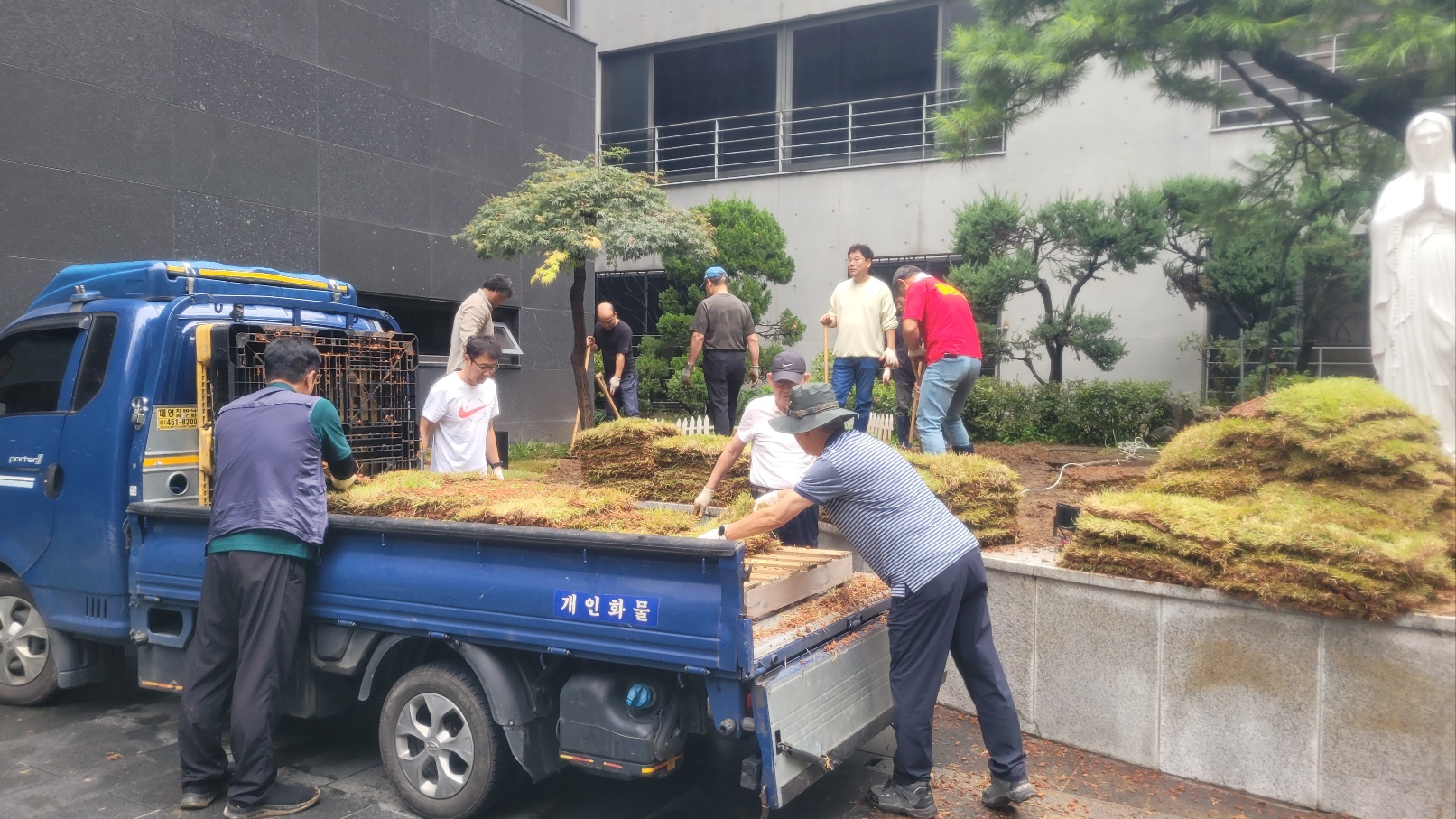 9월 20일(토) 우리 본당 시설분과와 레지오 단원들이 함께 힘을 모아 성모동산에 잔디를 심는 봉사를 진행하였습니다.
