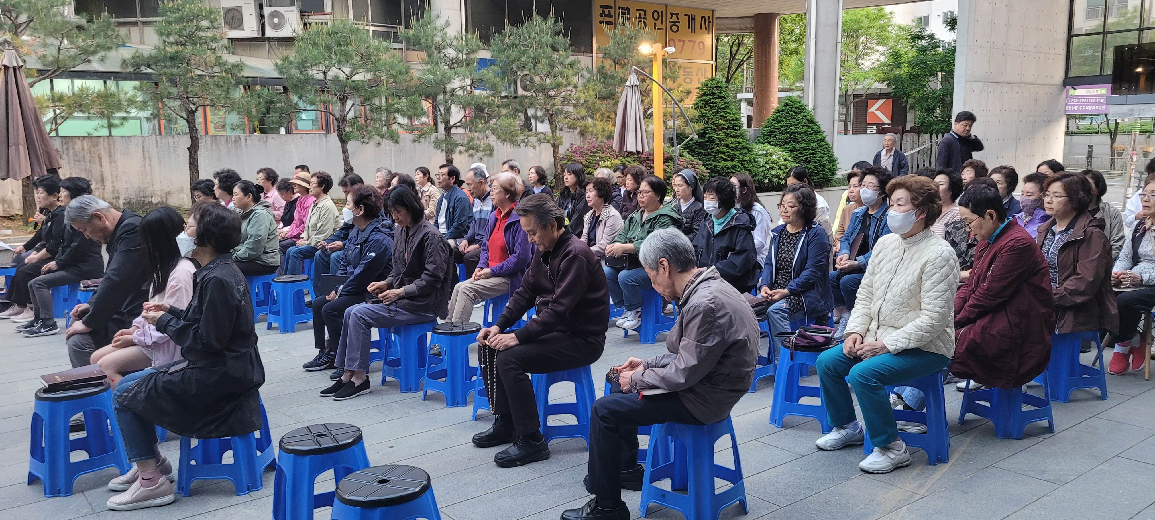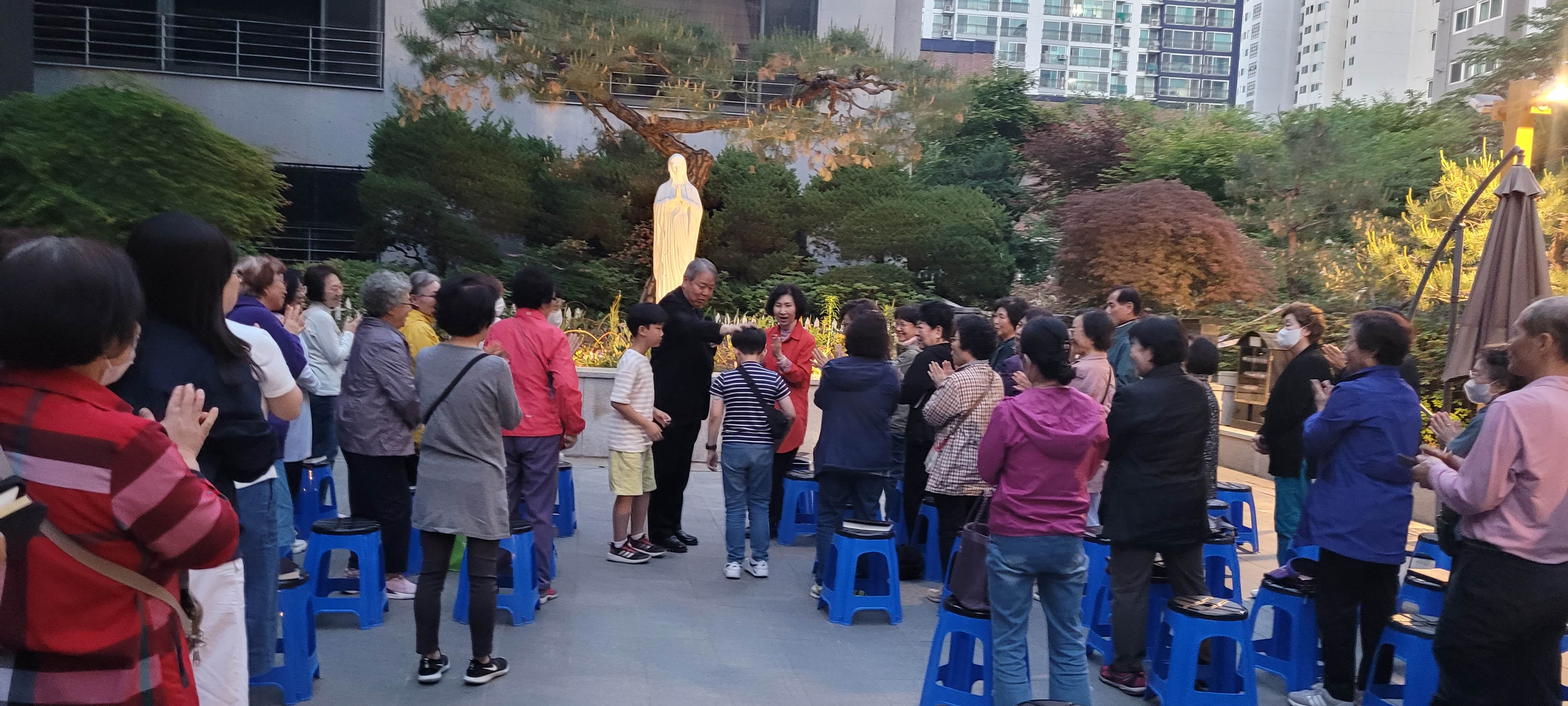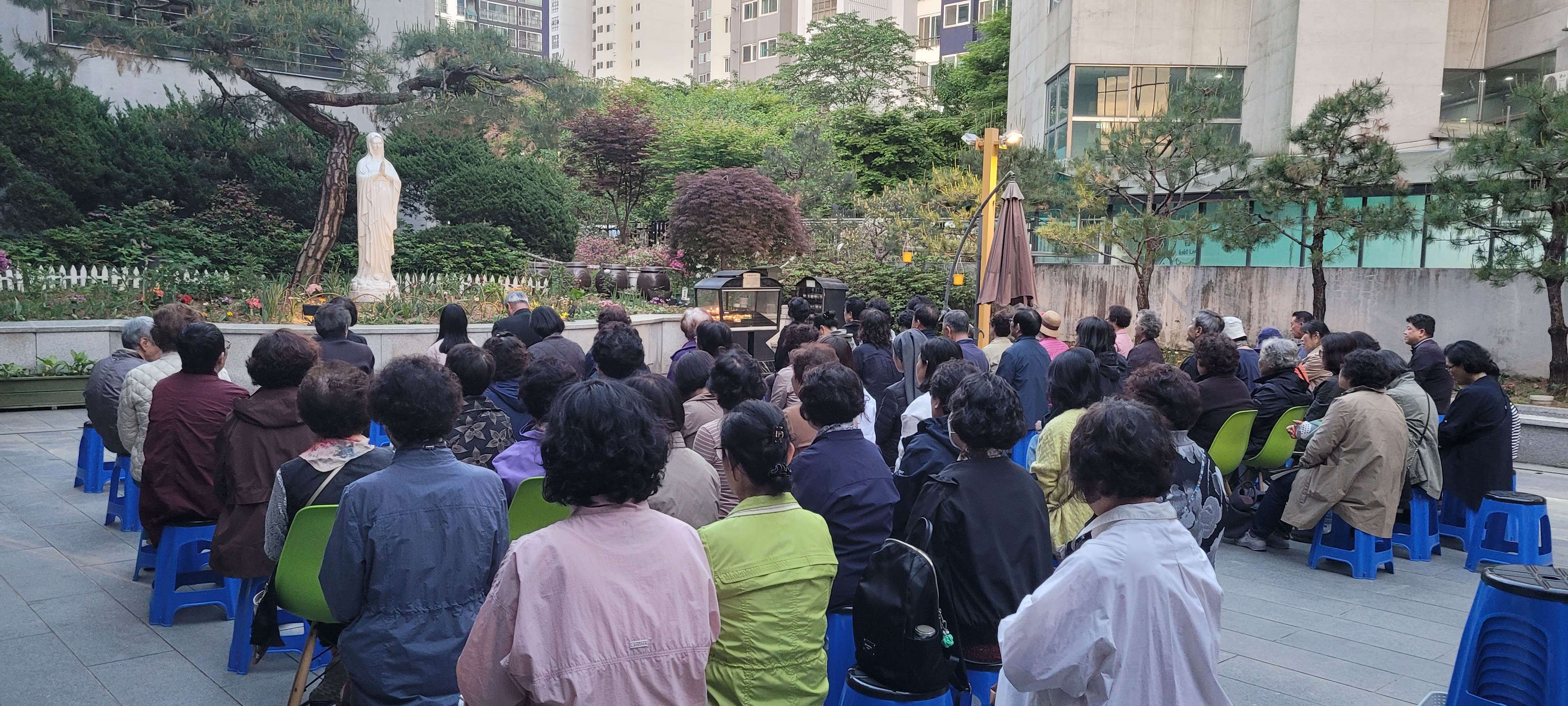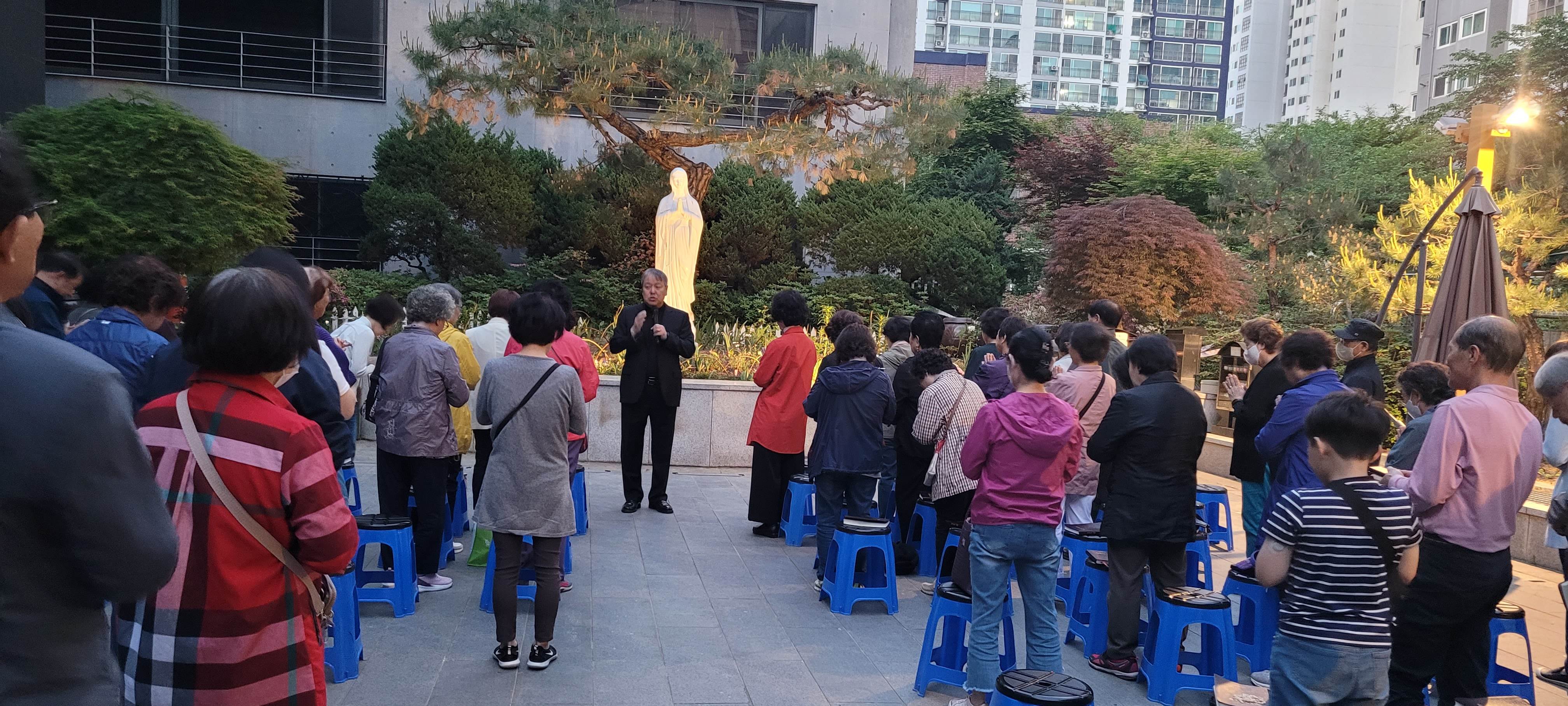 꽃피는 5월, 성모성월의 달이 되어, 성모 마당에서 다같이 묵주 기도를 봉헌하였습니다. 한 달 동안 매일 저녁 7시가 되면 모여 묵주 기도를 바치는 이 시간. 오늘은 초등학교 2학년 어린이가 엄마없이 혼자 와서 묵주 기도에 참여했다고 하네요. 바쁘다 피곤하다 핑계대며 함께 안했던 어른으로서 참 부끄럽네요.