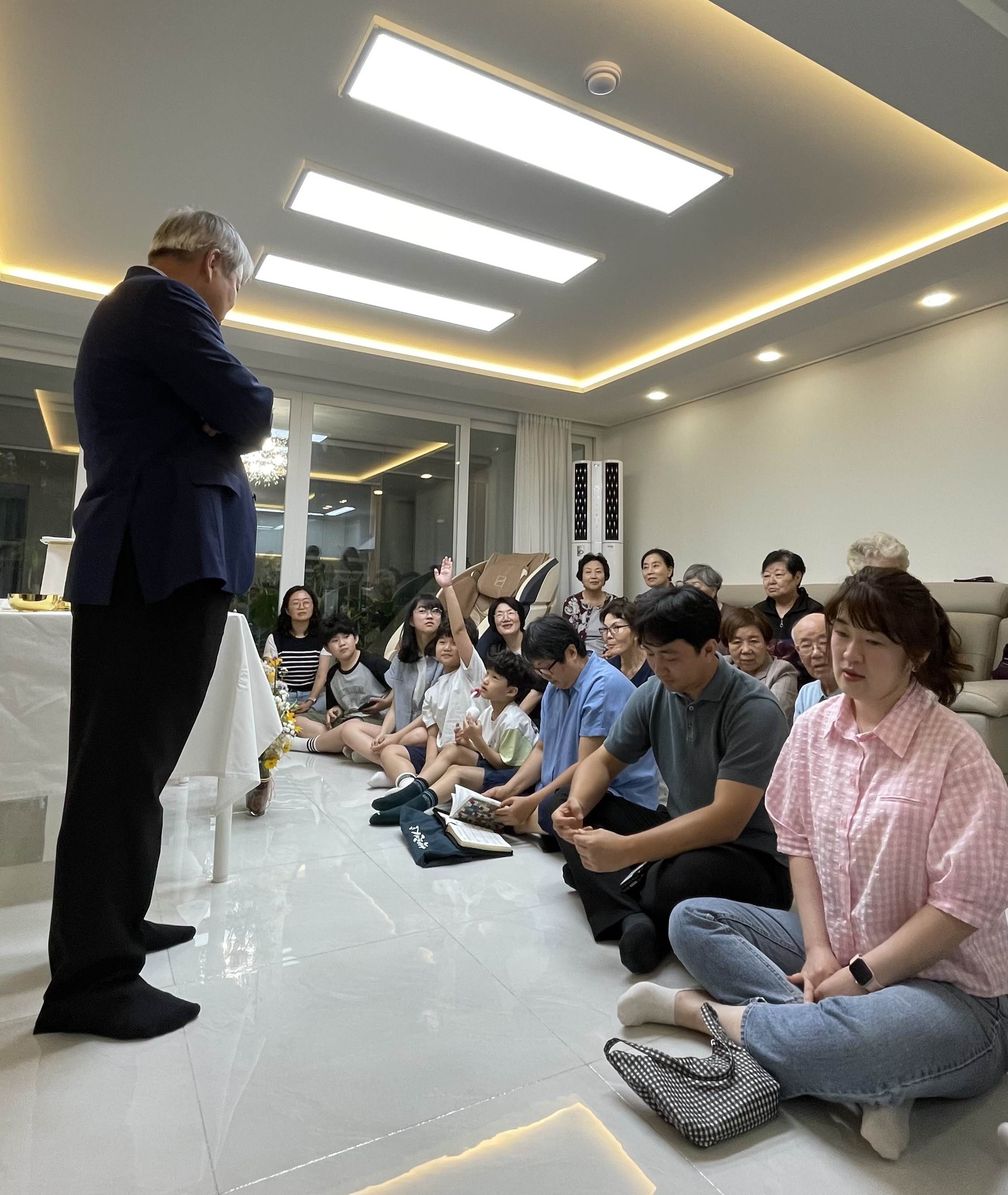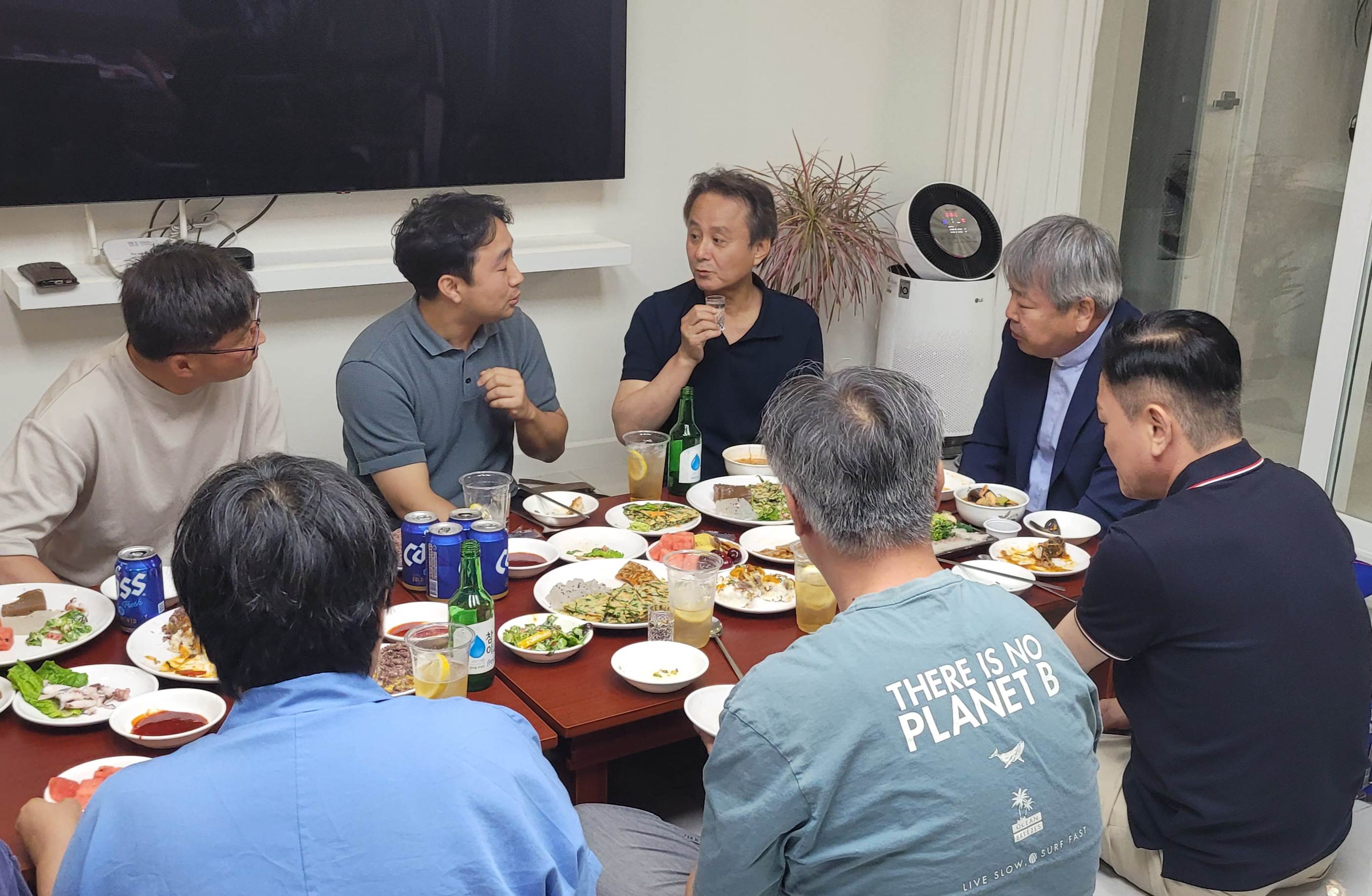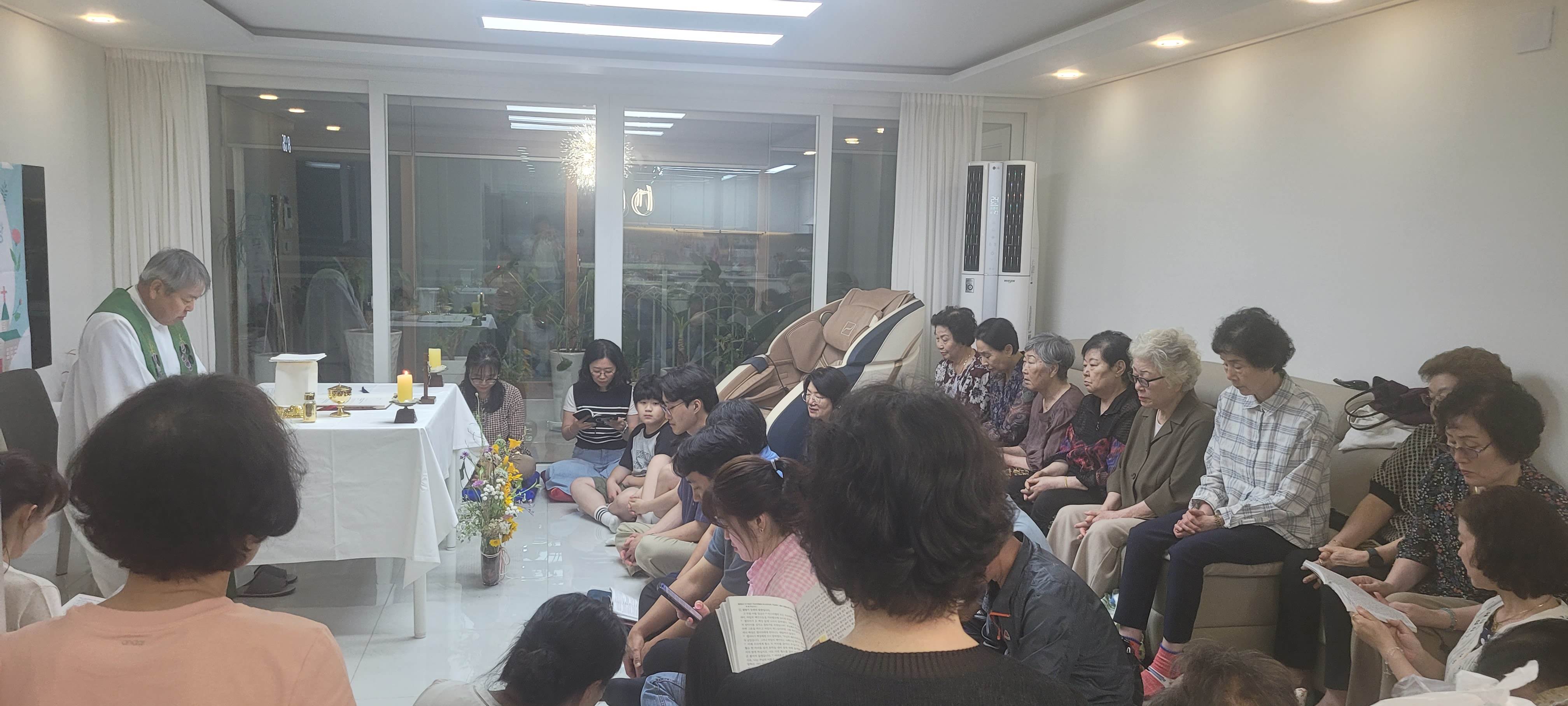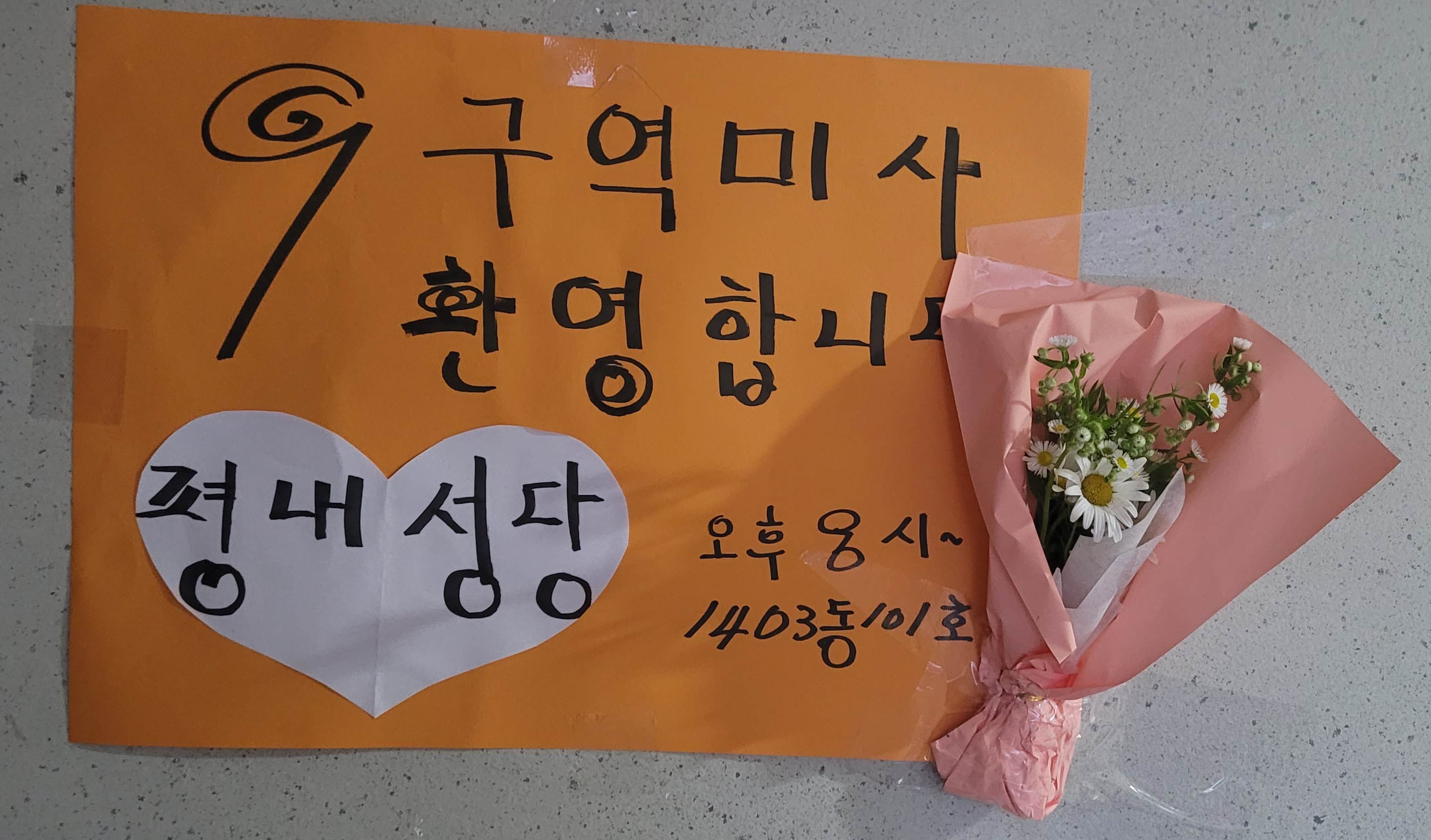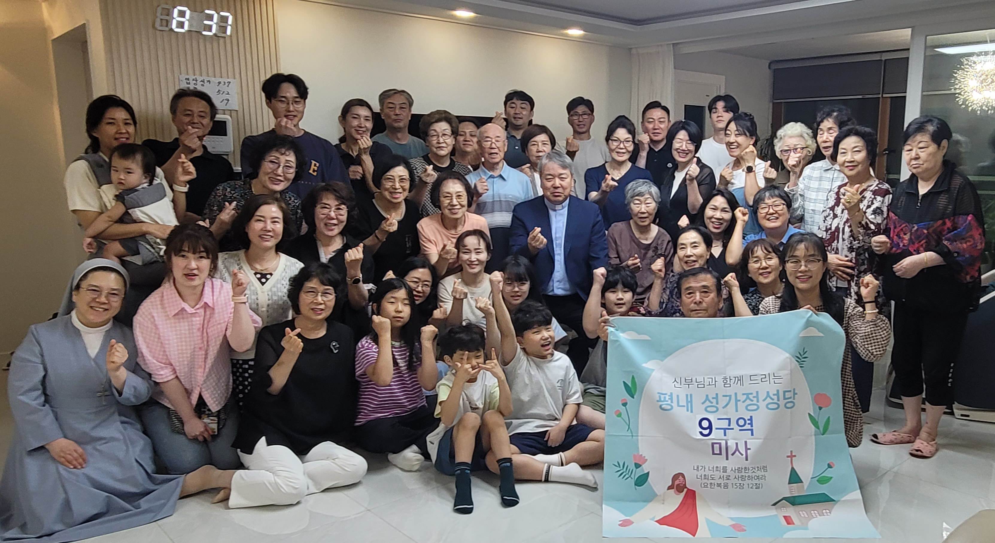 금호 아파트와 그 일대 상가 지역으로 이루어진 9구역 구역 미사 모습입니다. 문 앞에 환영글까지 붙여 맞아주시는 세심함과 온 가족이 함께 온 세대가 많았던 미사였습니다. 반장님들이 준비하신 하이볼로 모두 함께 건배하시고, 2살 아기부터 90살 어르신까지 주님 안에 다양한 모습으로 하나된 모습을 보여준 43명의 구역원들의 즐거운 파티날이었습니다.