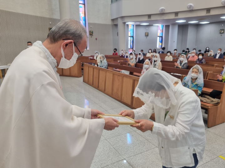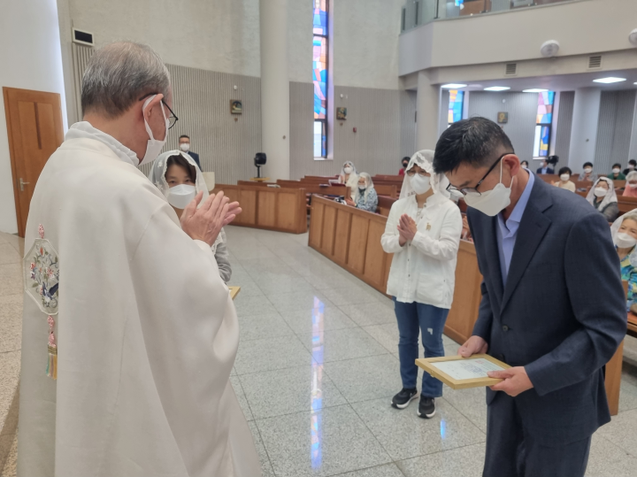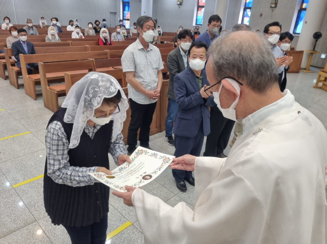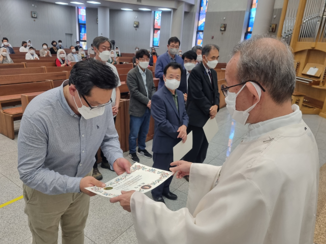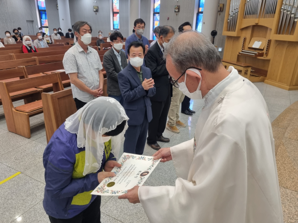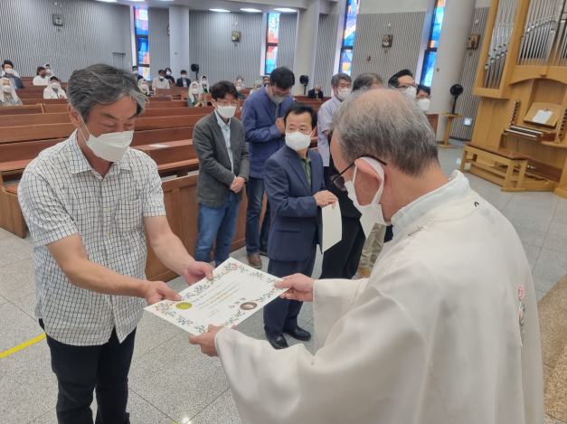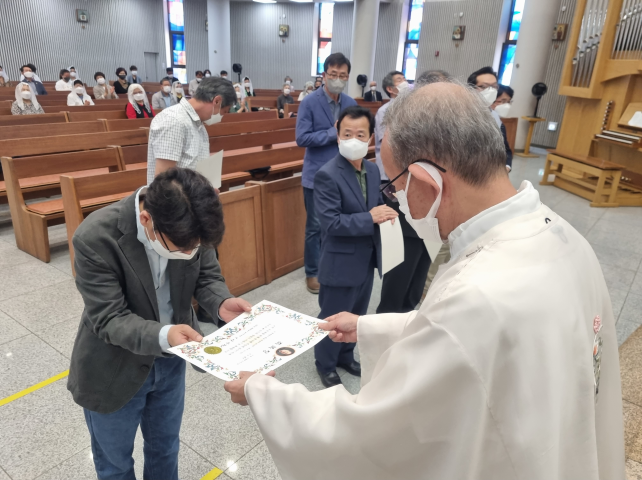 교중 미사 중 그동안 봉사하시느라 수고해 주신 구역 봉사자들께 주교님께서 주시는 축복장 수여식과 새로 임명되신 구역장, 분과장님의 임명식이 있었습니다.