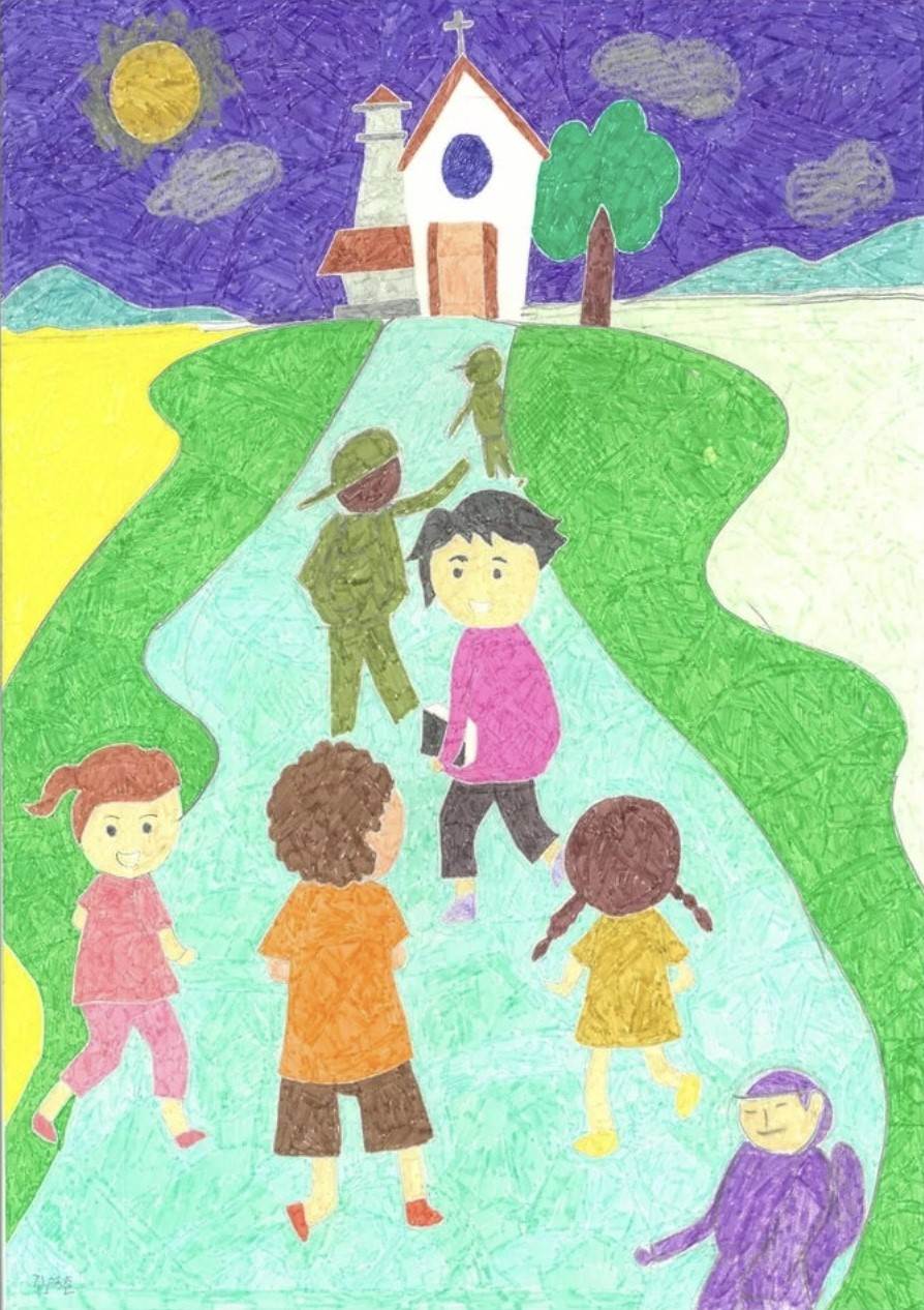 성당 주일학교 가는 길에 학생들의 즐거운 발걸음을 표현한 그림입니다.
