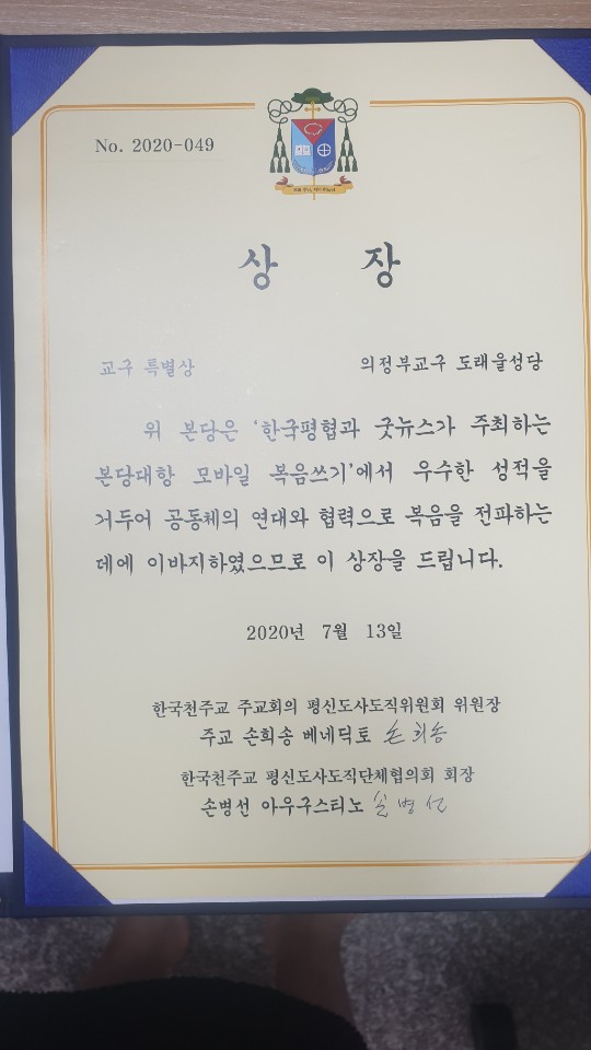 한국 평협과 함께하는 본당 대항 모바일 복음쓰기 도래울 본당 “교구특별상” 수상 "