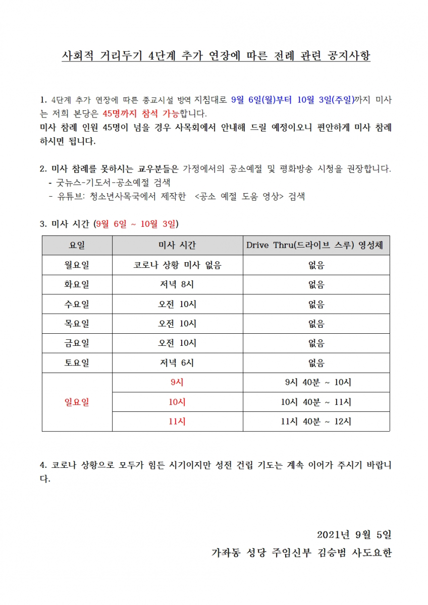 9월6일~10월3일 코로나 사회적 거리두기조정 4단계 추가 연장에 따른 미사 안내
