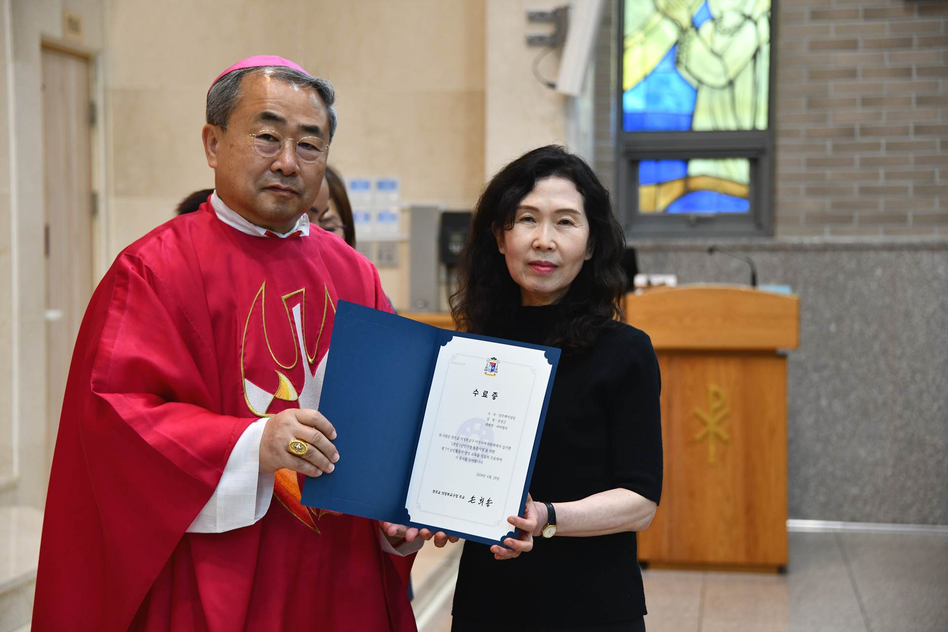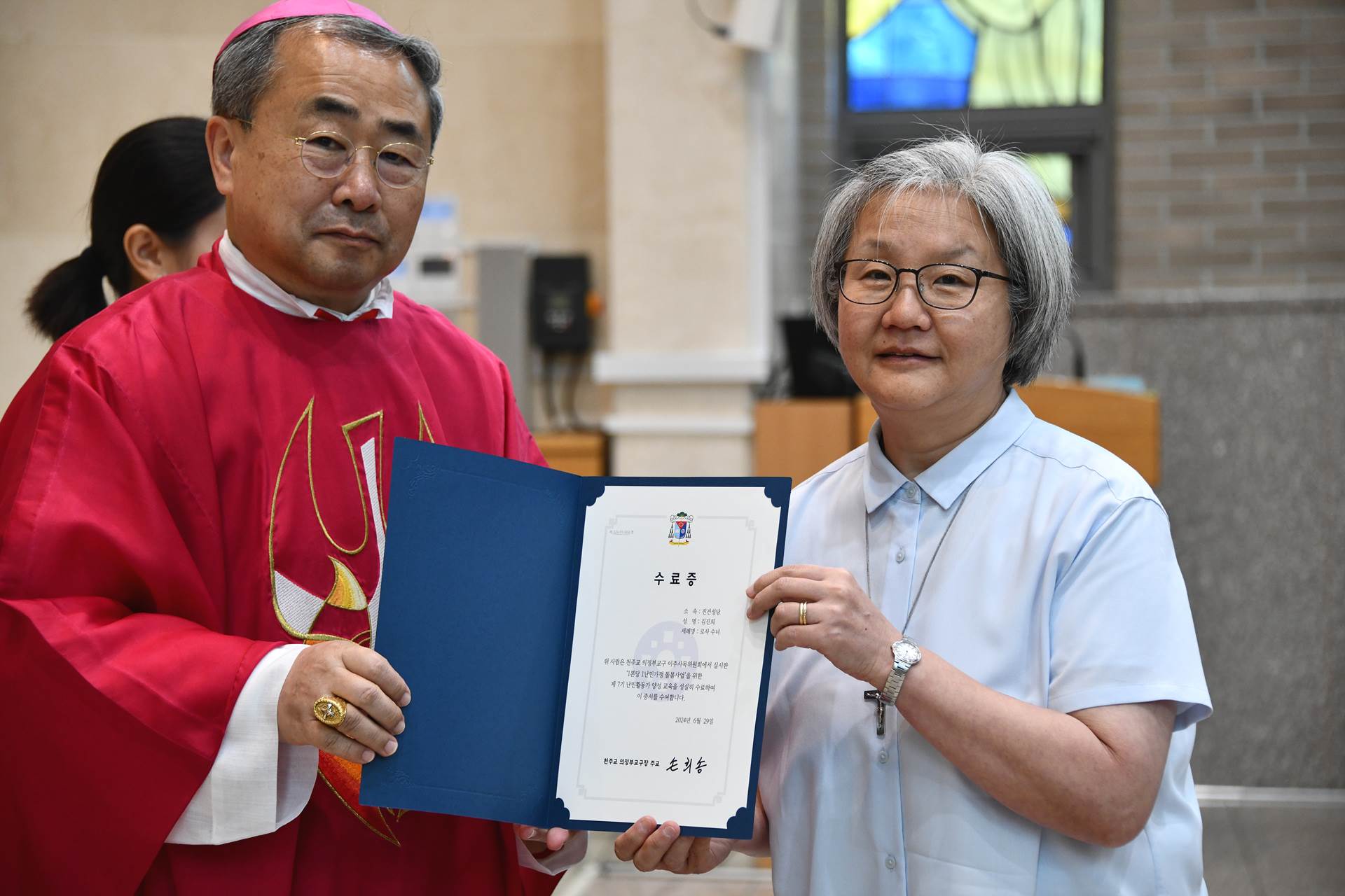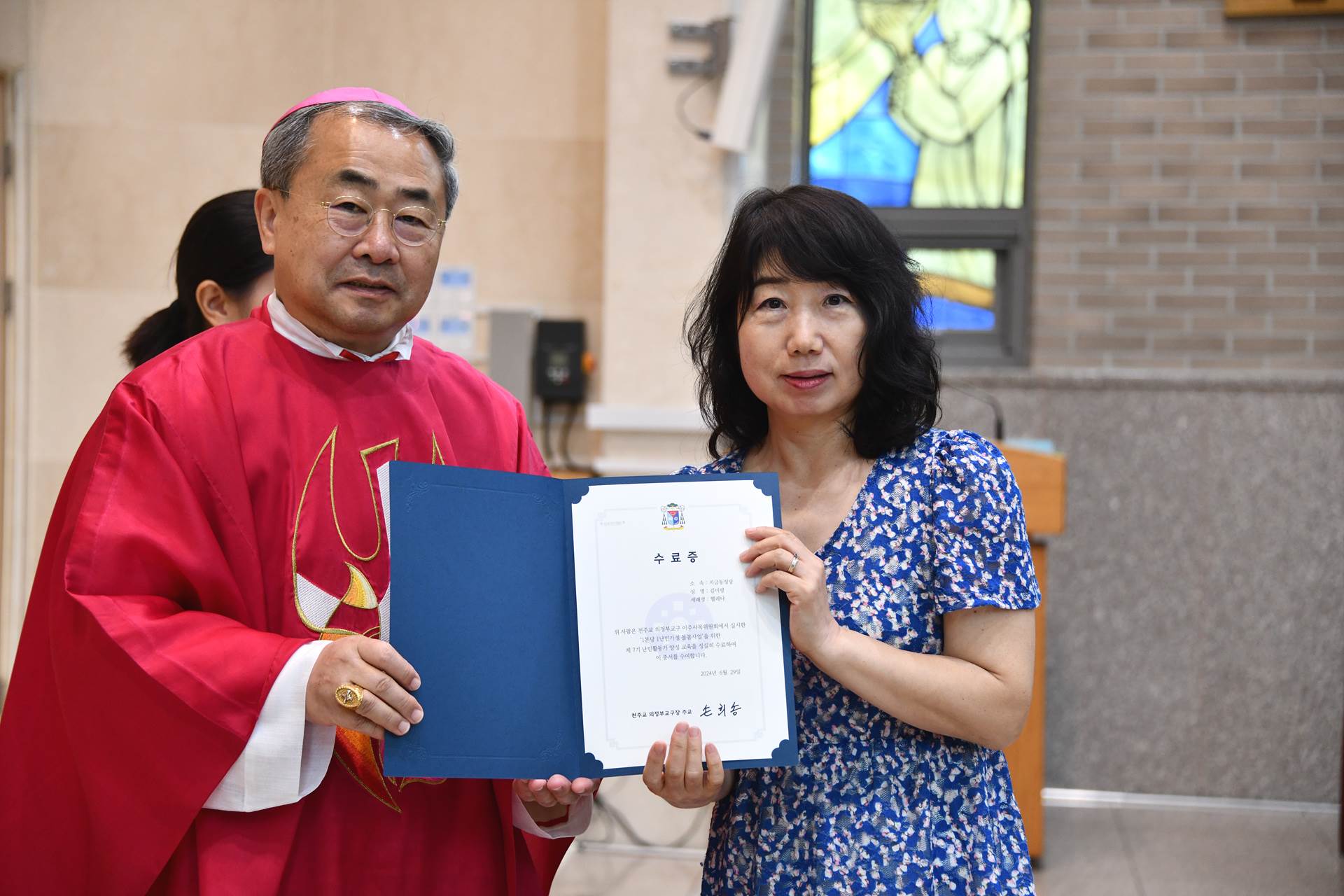 2024년 6월 29일 손희송 베네딕토 주교님 집전으로 11시에 이주사목미사 및 봉사자 수료식이 진행되었습니다.