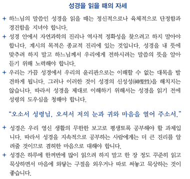 하느님의 말씀인 성경을 읽을 때는 정신적으로나 육체적으로 단정함과 경건함을 지녀야 합니다.