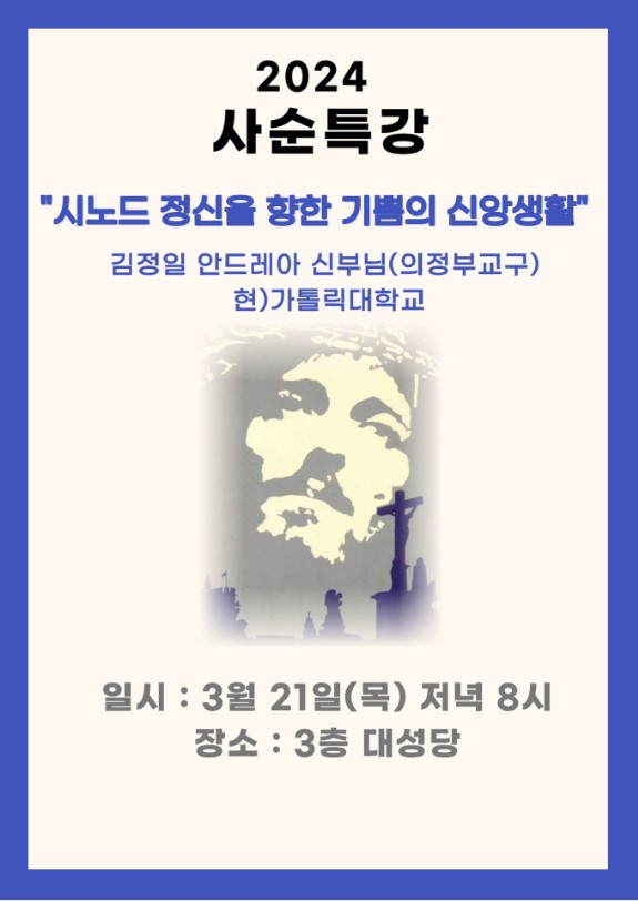 3/21(목) 20시 성당 3층 대성당에서 김정일 안드레아 신부님을 모시고, ‘시노드 정신을 향한 기쁨의 신앙생활’이라는 주제로 사순특강이 있습니다.