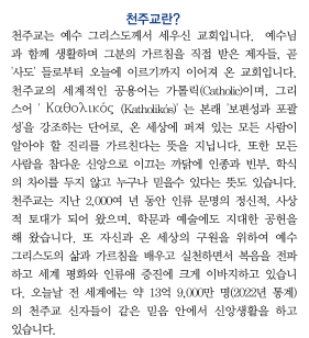 천주교는 지난 2,000여 년 동안 인류 문명의 정신적, 사상적 토대가 되어 왔으며, 학문과 예술에도 지대한 공헌을 해 왔습니다.