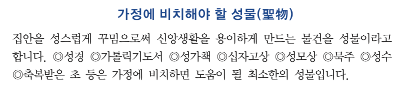 집안을 성스럽게 꾸밈으로써 신앙생활을 용이하게 만드는 물건을 성물이라고 합니다.