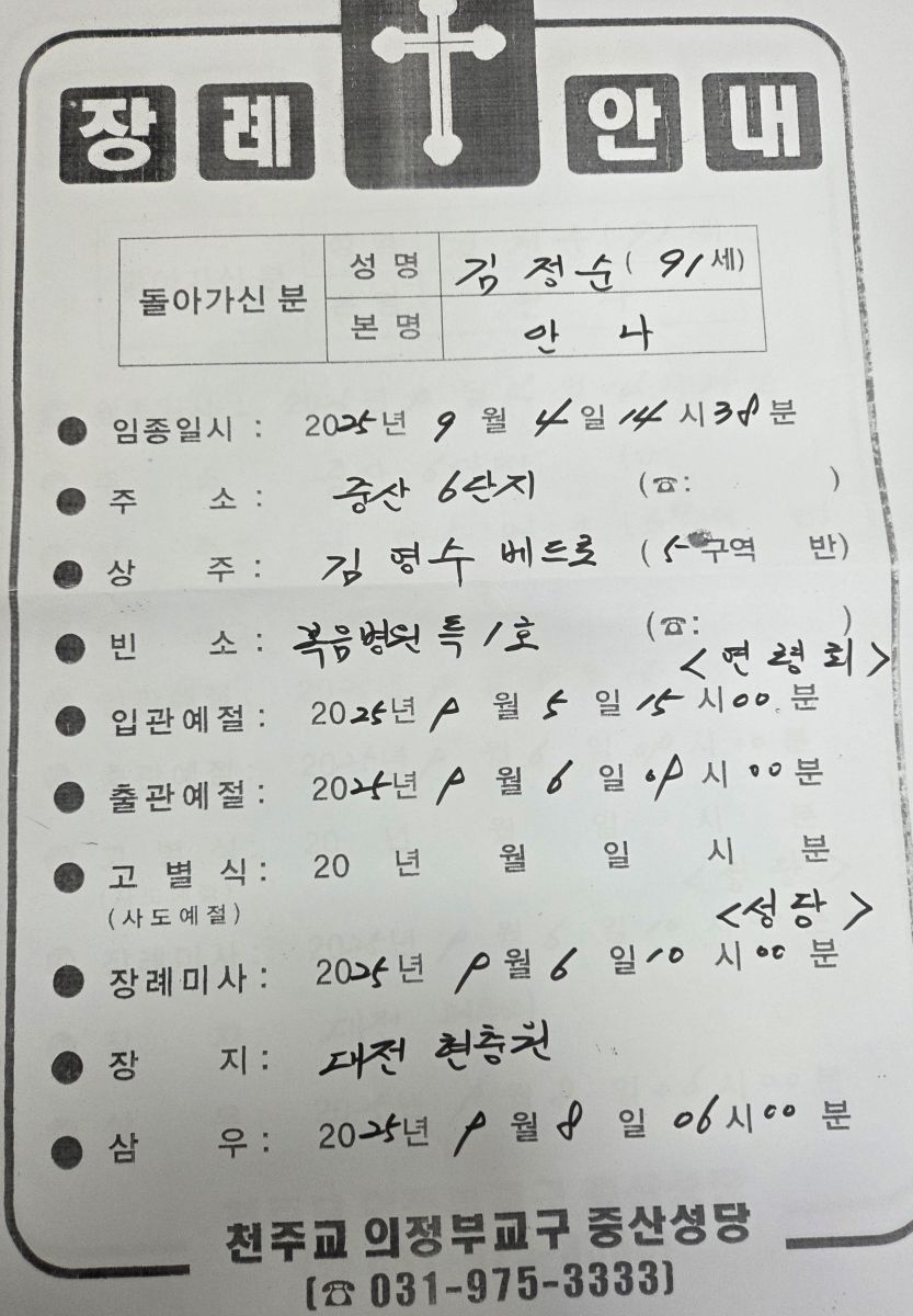 <연도 공지> 김정순 안나 장례 미사 9/6(토) 오전 10시, 대성전