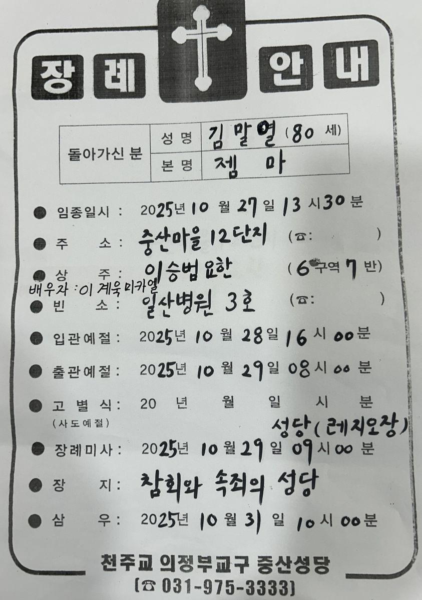 <연도 공지> 김말열 젬마 장례 미사 10/29(수) 오전 9시, 대성전