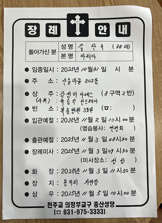 <연도 공지> 김단옥 마리아 장례 미사11/3(월) 09시 30분, 대성전
