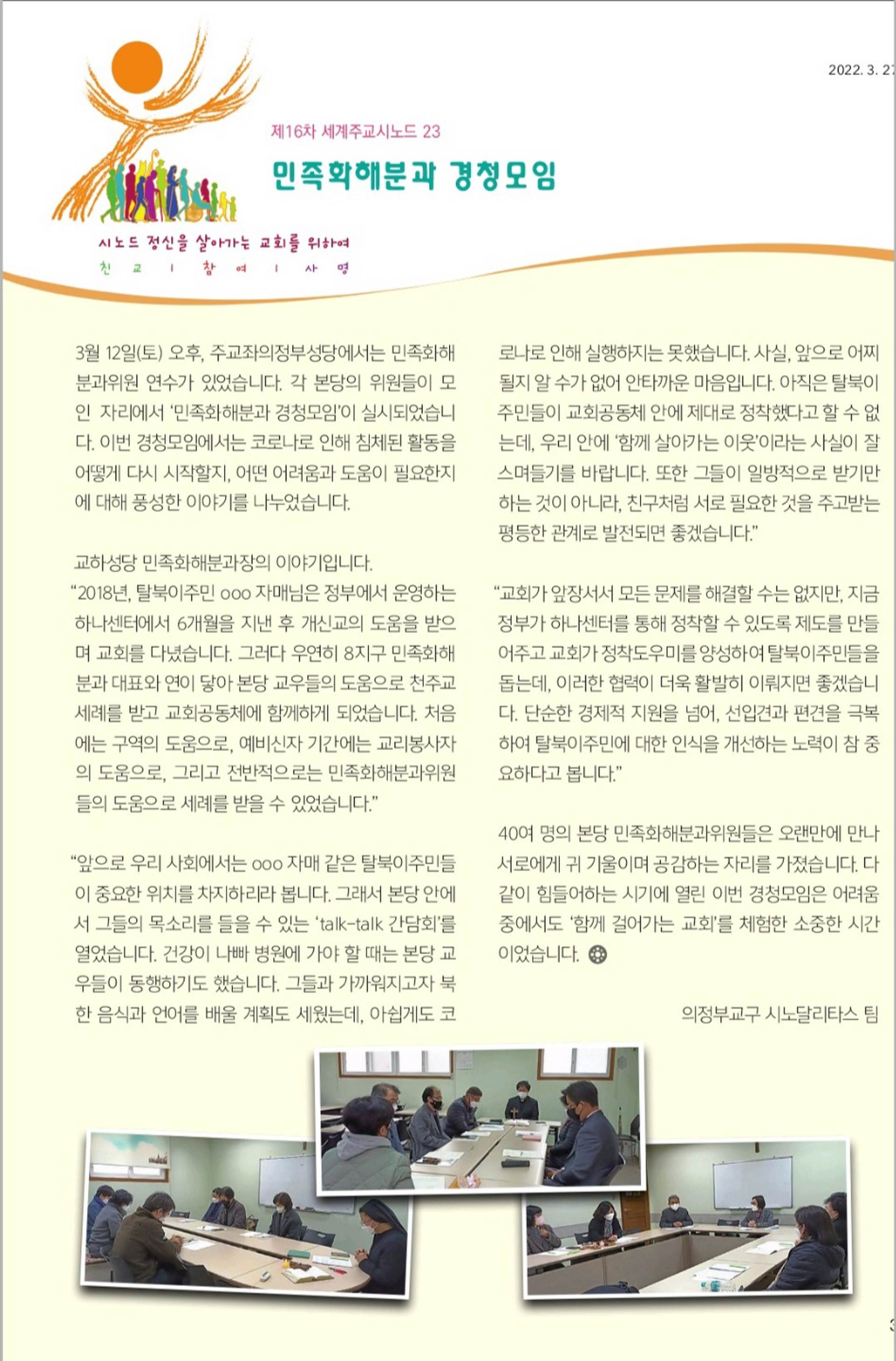 코로나 팬데믹으로 어려움을 겪고 있는 이 시기에 1차 본당 경청모임이 우리 신앙과 공동체가 회복하는데 희망의 마중물이 될 수 있도록 관심을 가지고 함께 기도하며 참여해주셔서 감사합니다. (의정부교구 시노달리타스팀)