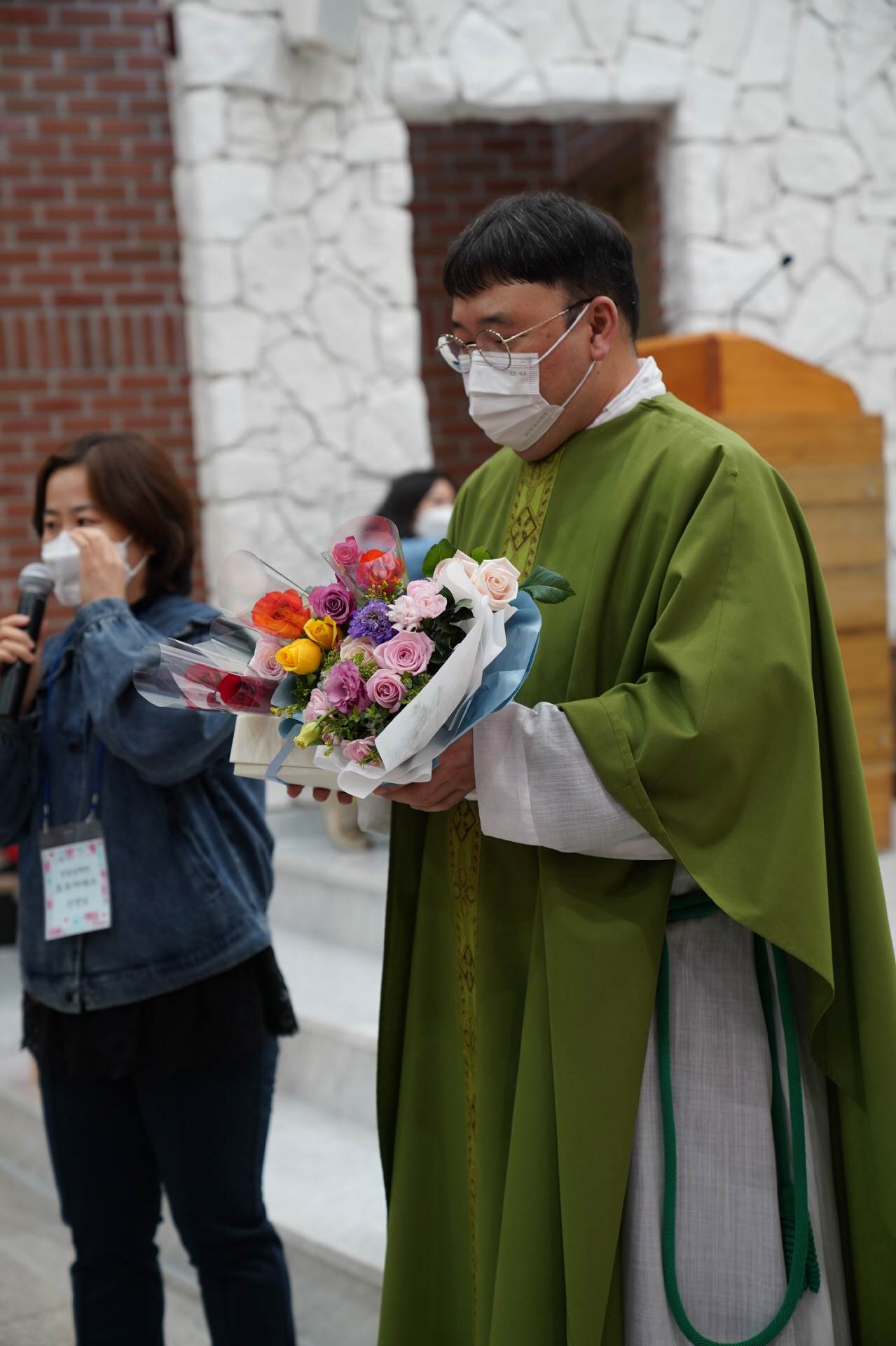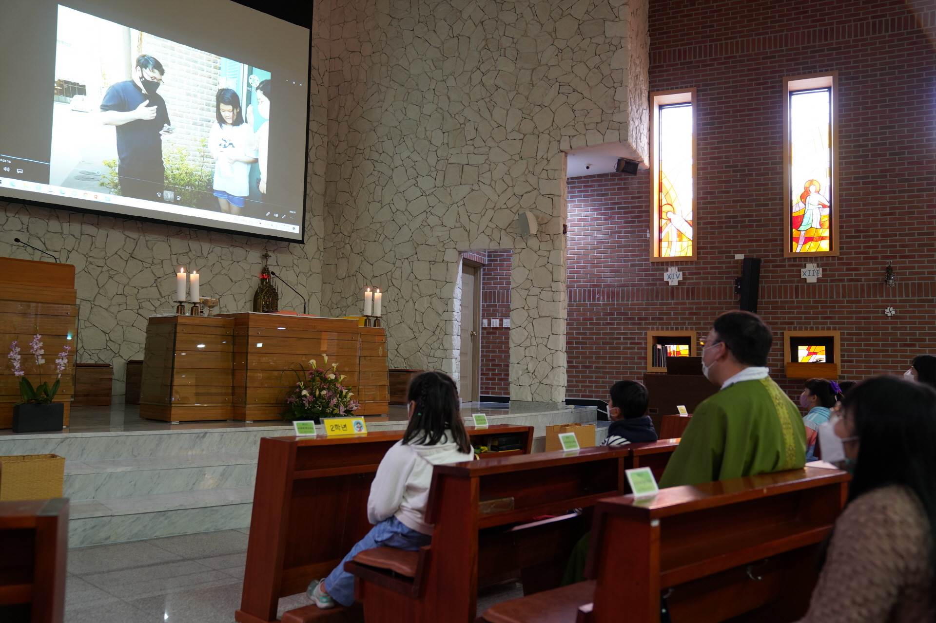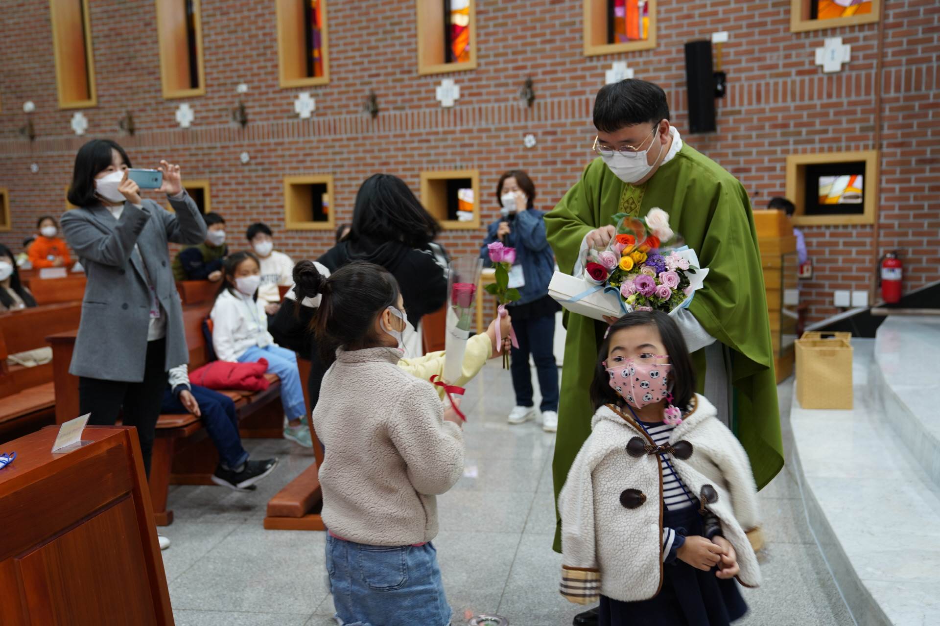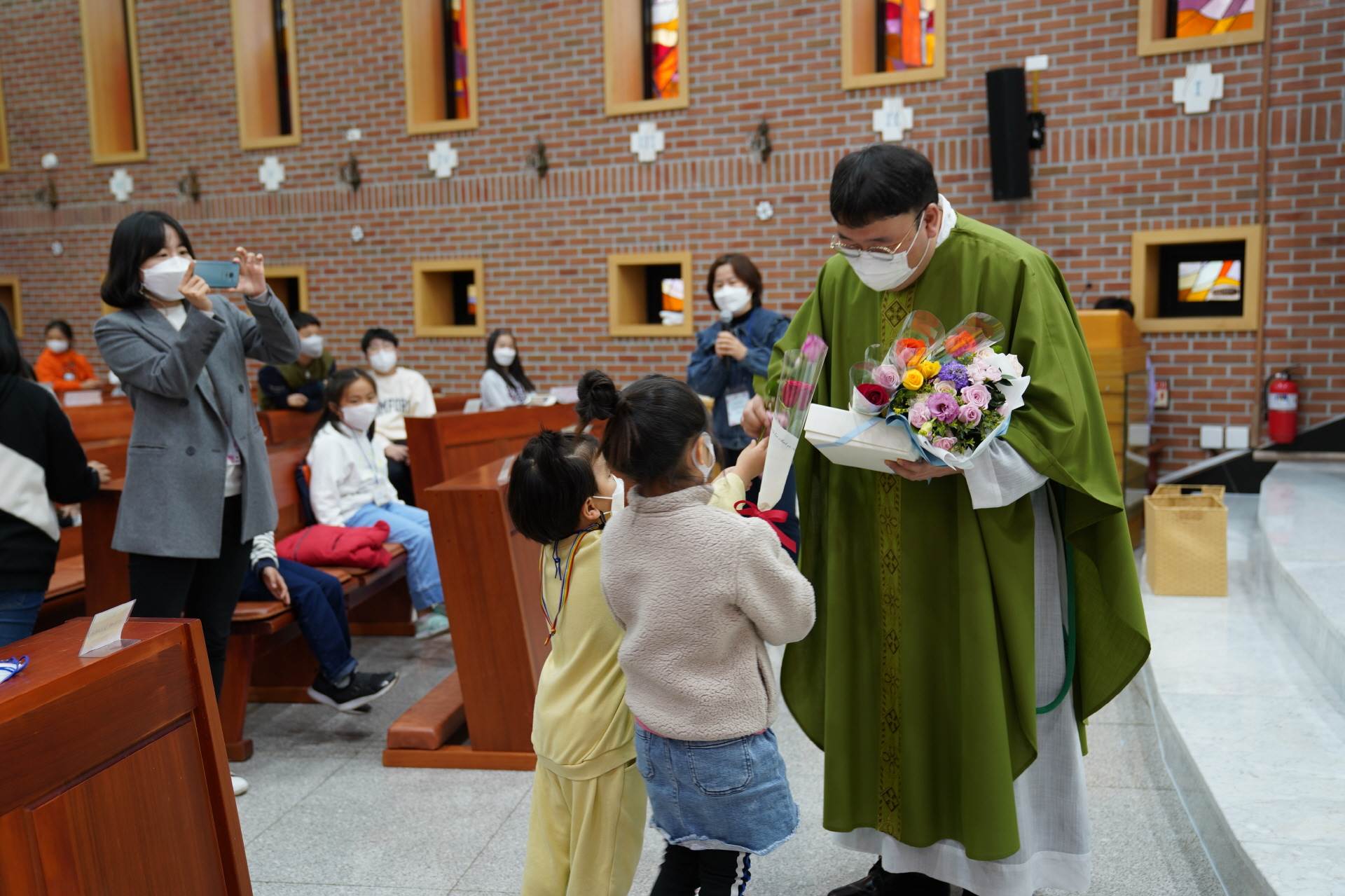 예수님께서 카톡으로 보내주셨다는 축하영상을 함께 감상하고 우리 친구들이 준비한 송이송이 꽃선물에 감동한 우리 레오신부님.