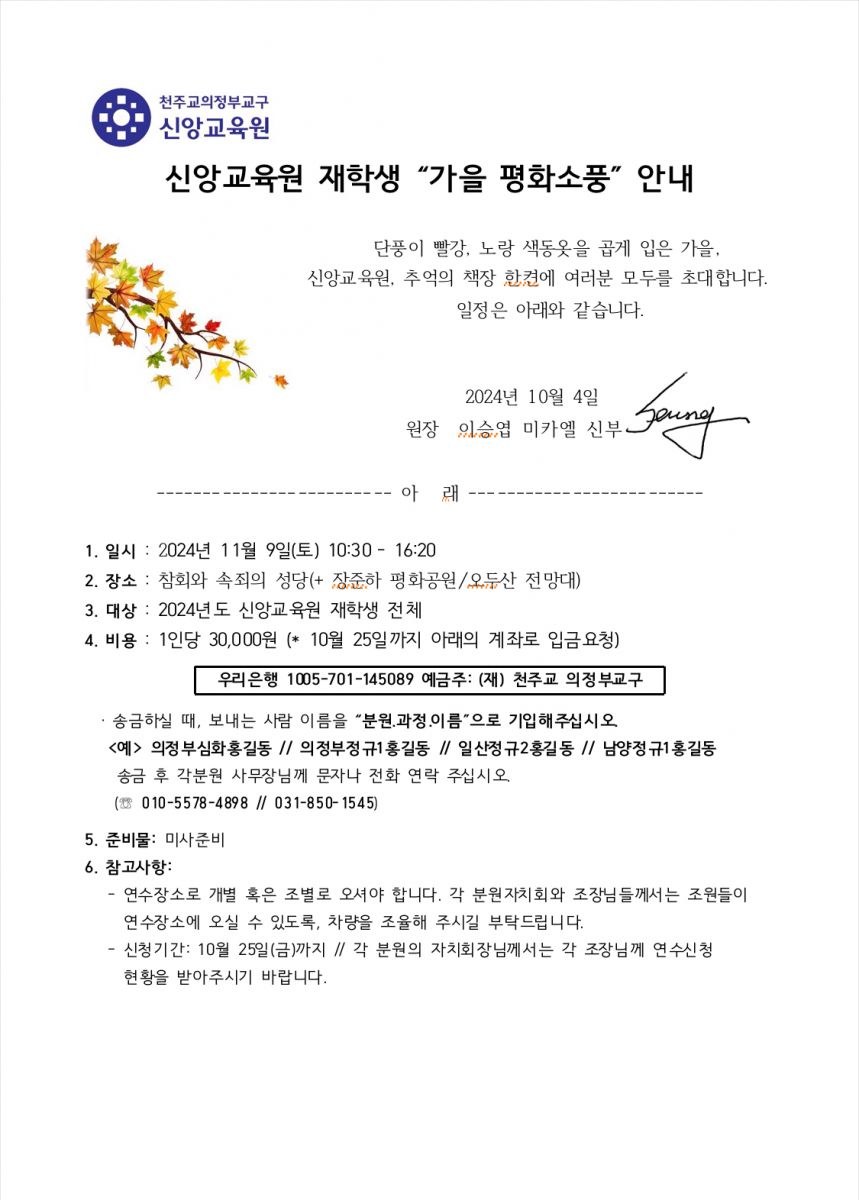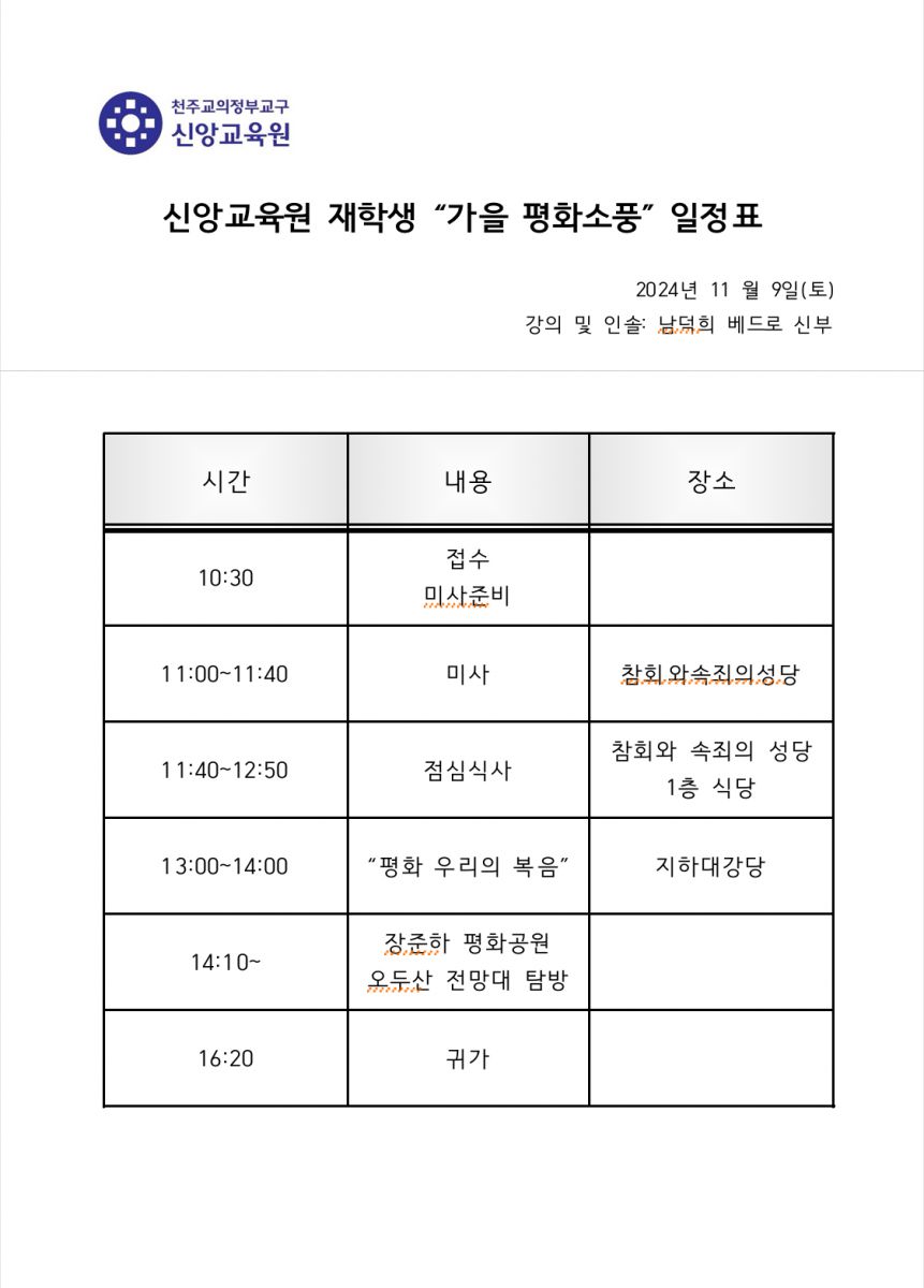 신앙교육원 재학생 "가을 평화 소풍 " 안내