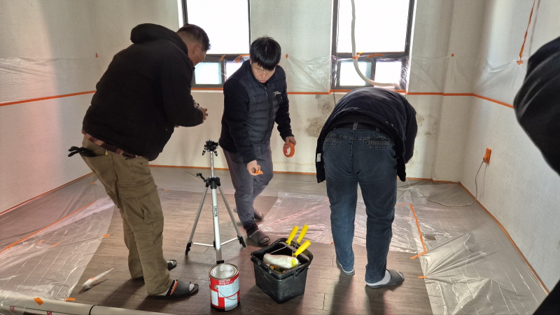 성전 건축으로 인한 임시 이전 성전의 사무실의 도배 작업.