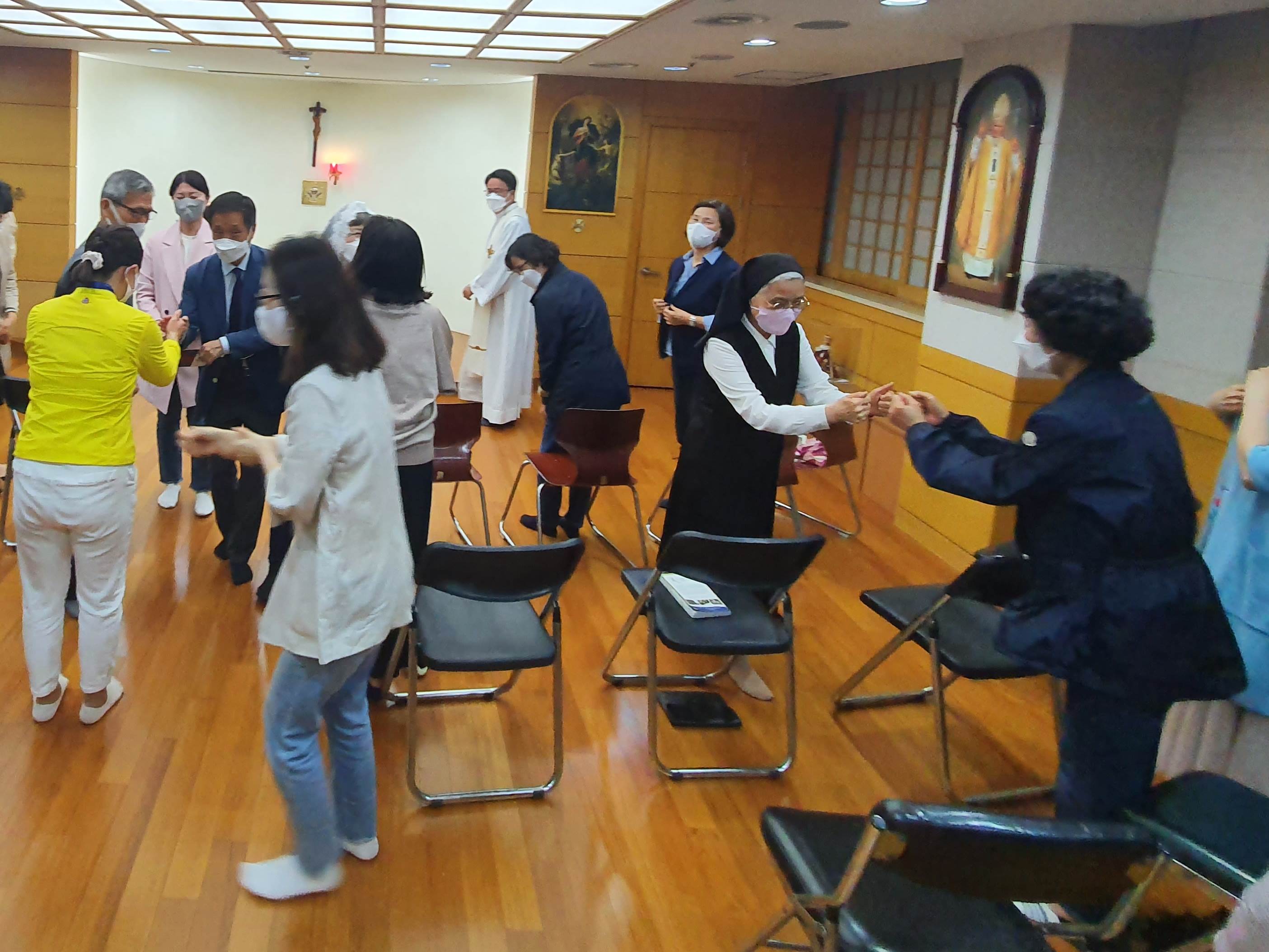 서로의 소개와 함께 진행된 미사가 평화의 인사때는 서로 서먹함도 조금씩 사라지는 은총의 시간이었습니다.