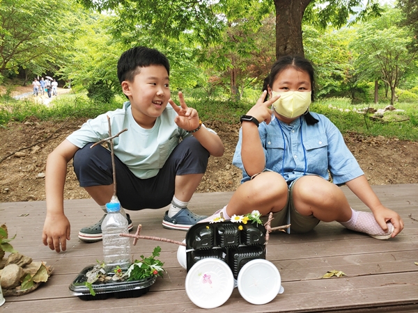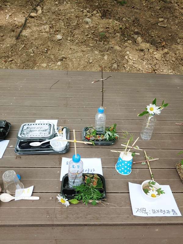 교육관에서 도시락을 먹기 전, 도시락에 제공된 재활용품(식기, 수저, 물병 등)과 기도의 숲에서 구할 수 있는 자연물을 이용하여 ‘자연물 장식품 만들기’를 안내해보았습니다. 식사를 하면서 가족끼리 무엇을 이용하고, 어떻게 만들지 대화하는 모습이 즐거워보였습니다.