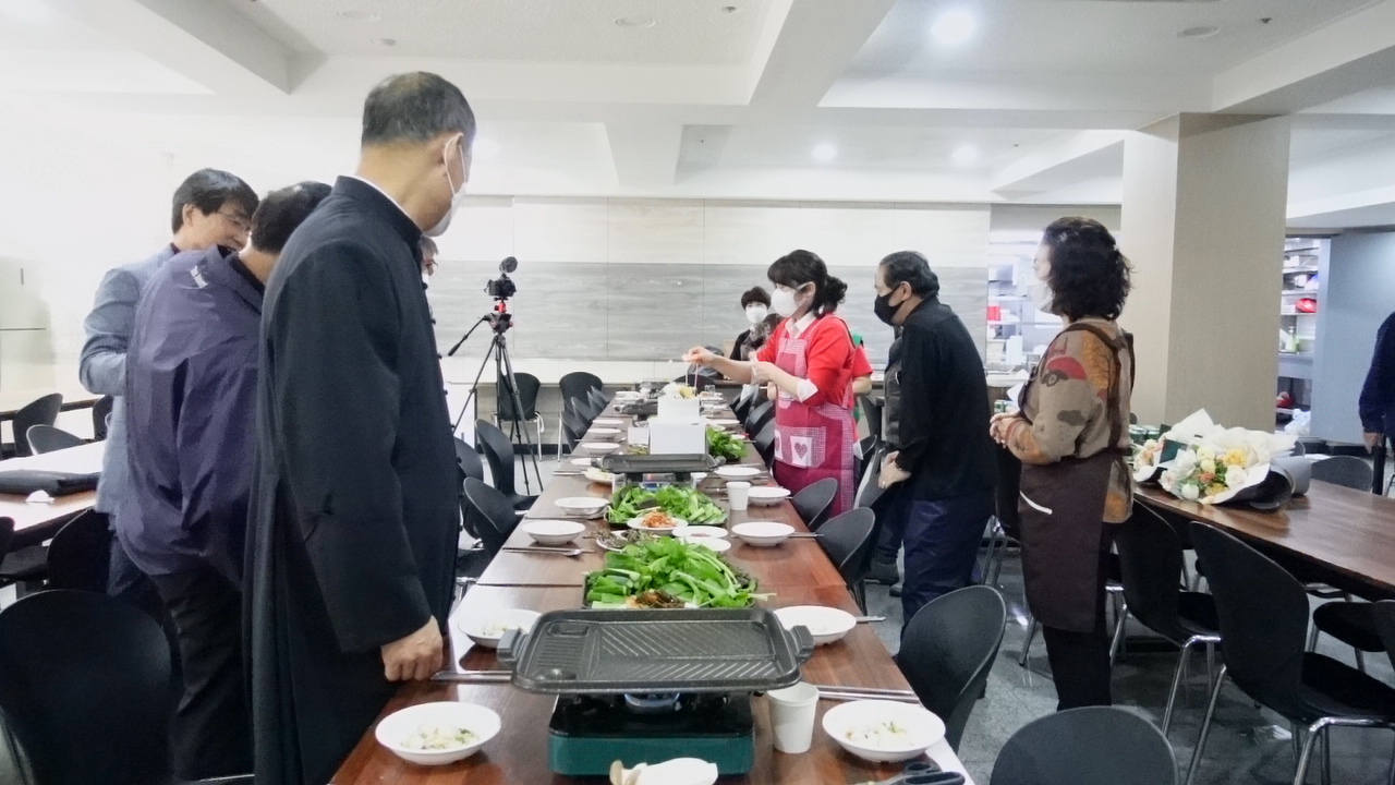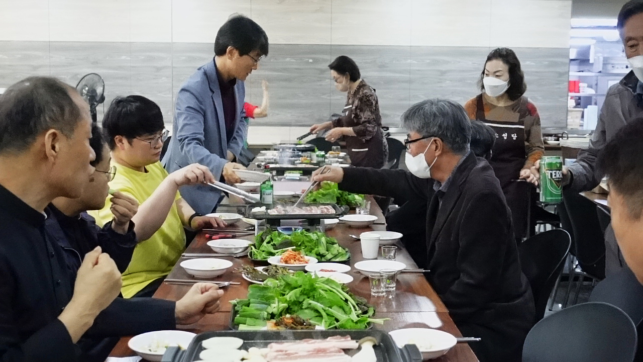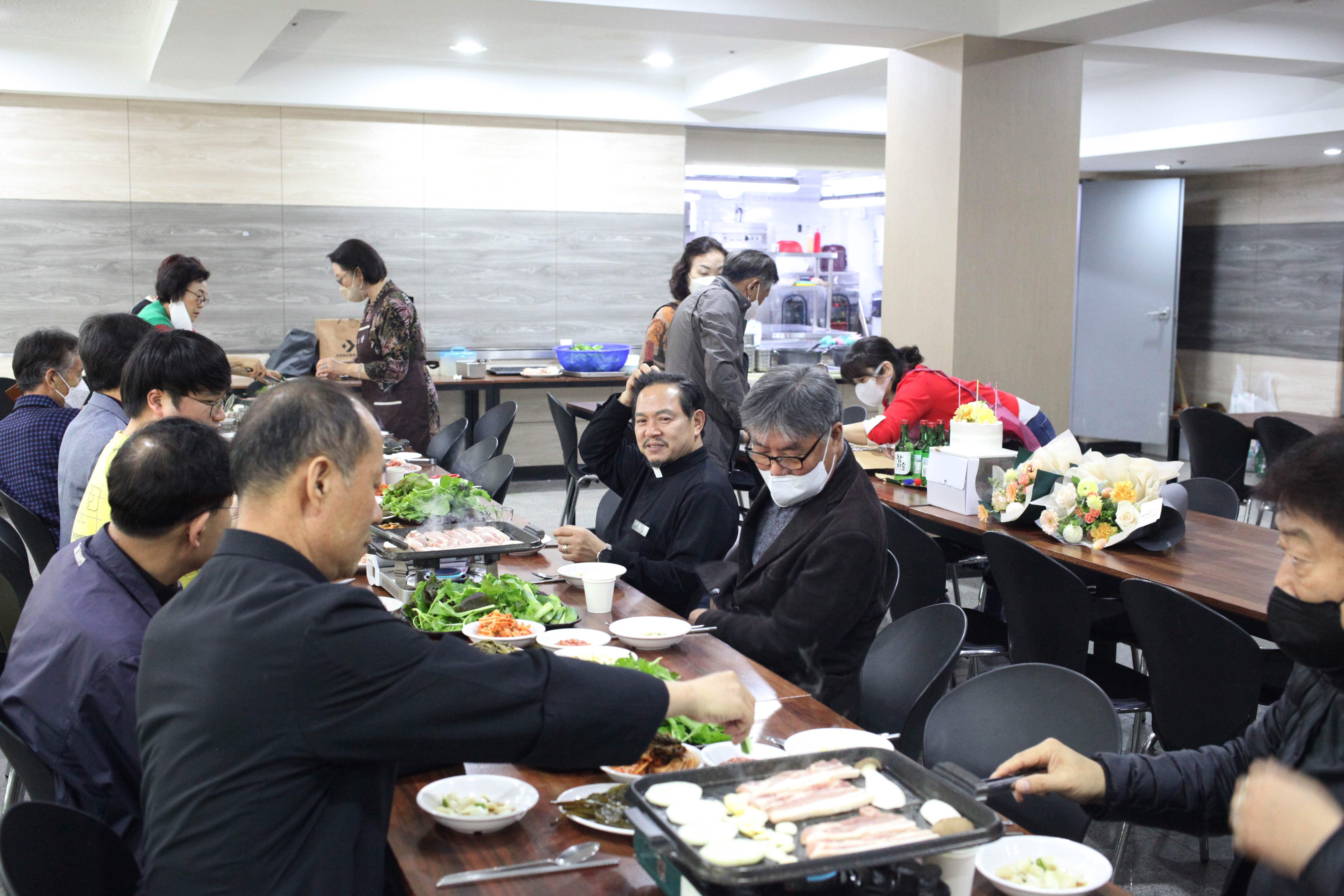 지하 식당에서 간단한 케익 축하식과 삼겹살 파티로 간소히 축하 파티를 하였습니다.