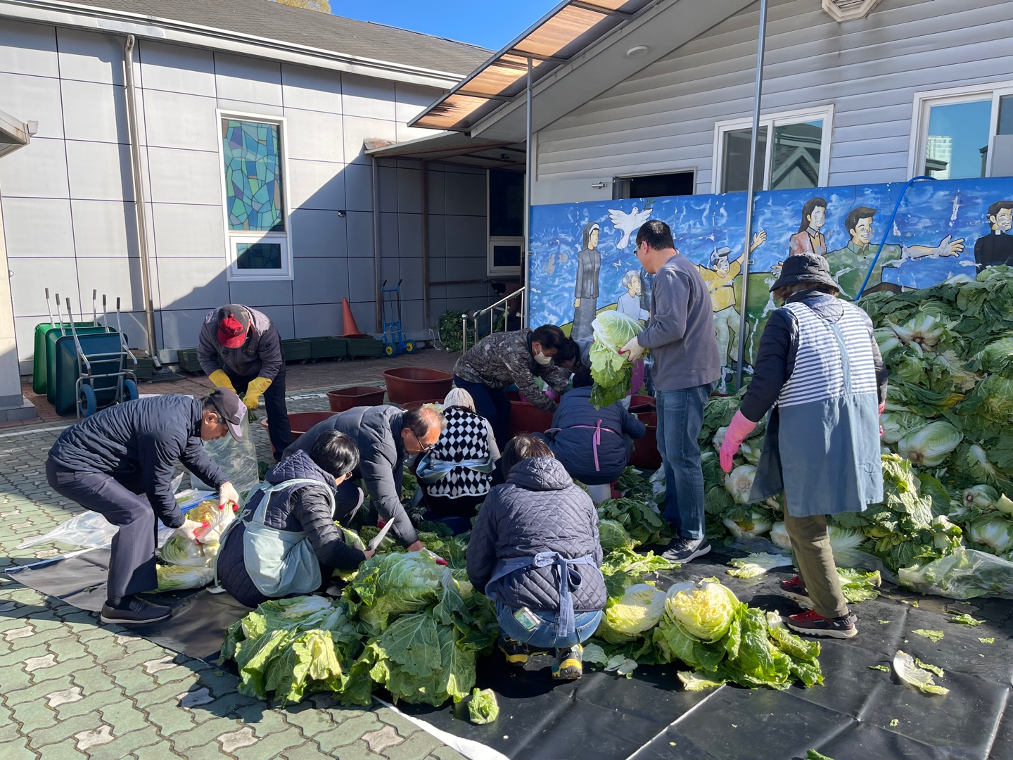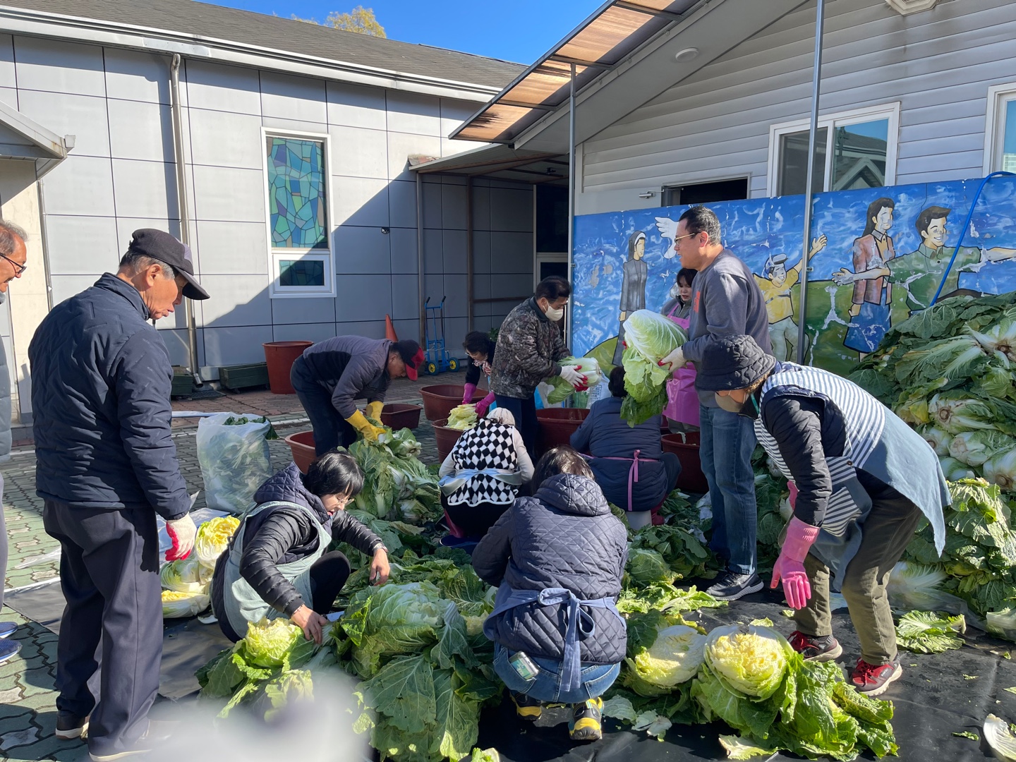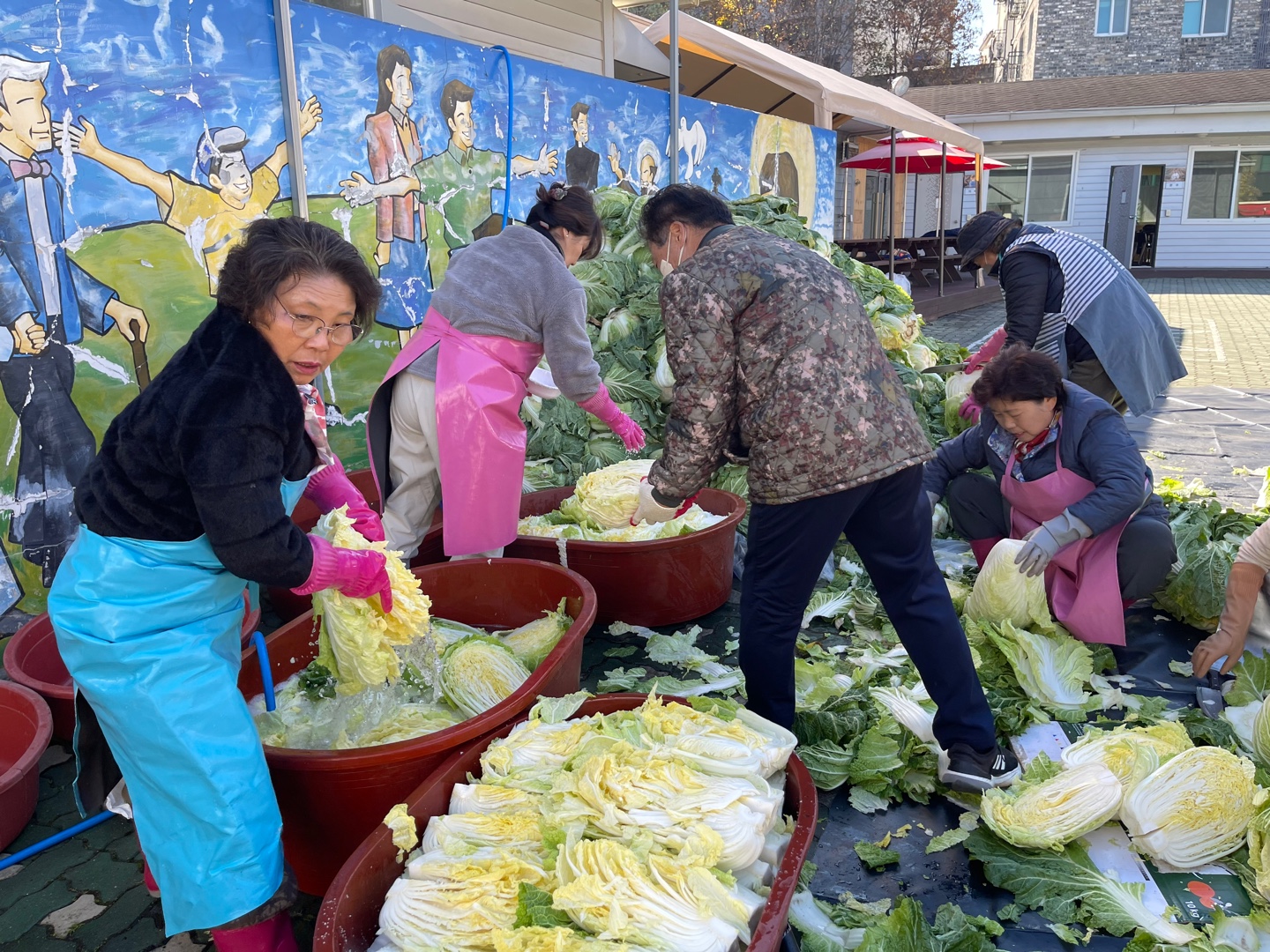 추운 날씨에 배추 420포기 절이고 김장을 준비하는 모습