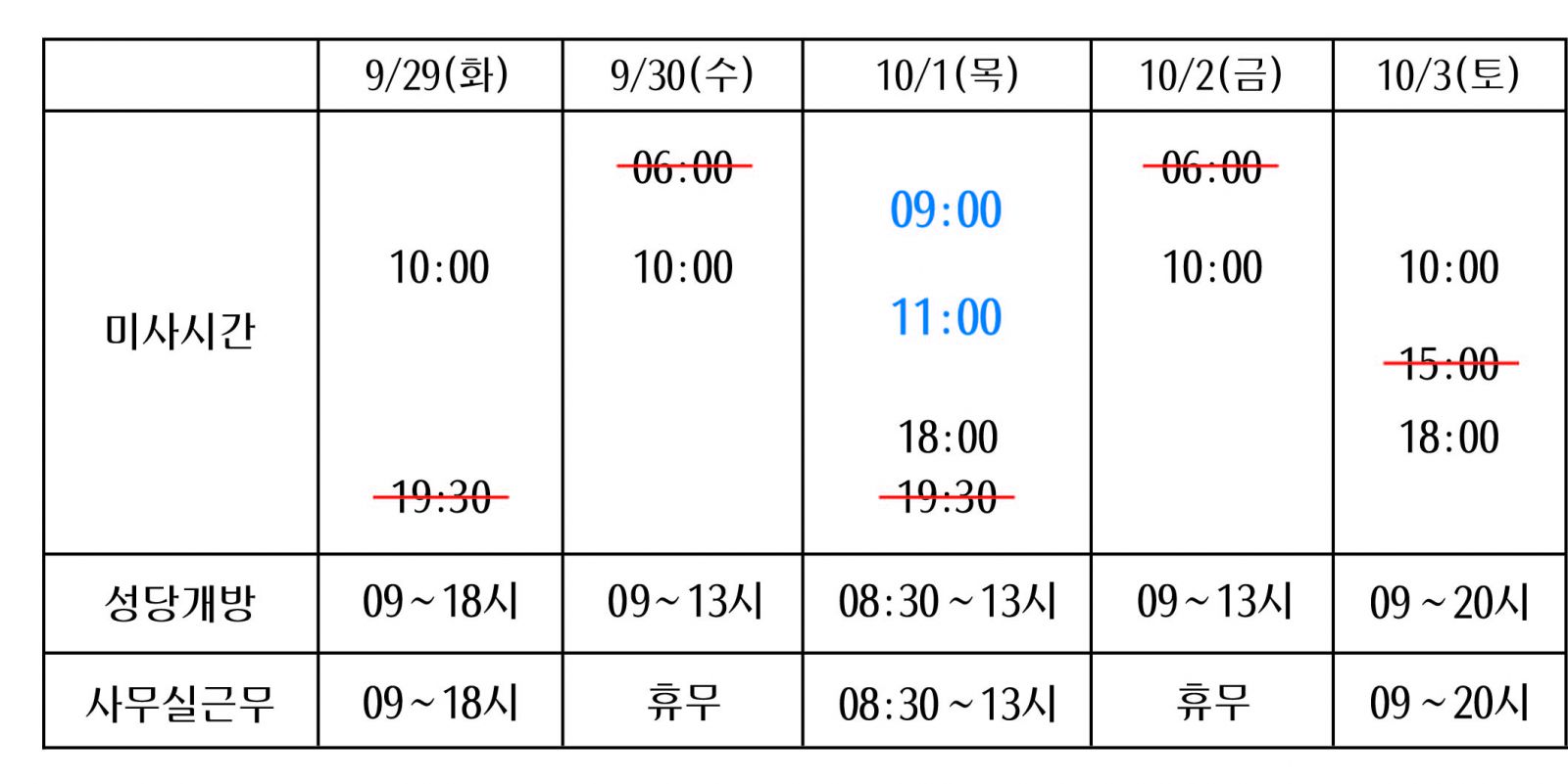 추석연휴 중 미사 및 성당개방 시간 안내